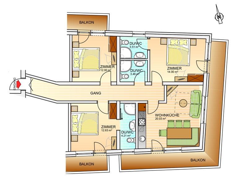 Das Apartment verfügt über 3 Schlafzimmer mit Doppelbett, 2 Badezimmer mit Dusche/WC, 2 Zusatzbetten, Kabel-TV, Internet, Safe, Fön, Telefon und Balkon. Die Wohnküche ist ausgestattet mit Ceranfeld-Herd, Dunstabzug, Kühl-Gefrierschrank, Mikrowelle, Geschirrspüler, Kaffeemaschine und Geschirr. Größe ca. 80 m². Auf Anfrage getrennte Betten möglich.