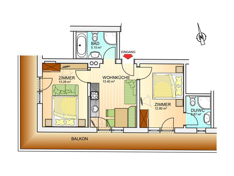Das Apartment verfügt über 2 Schlafzimmer mit Doppelbett, 2 Badezimmer mit Dusche/WC, 2 Zustellbetten, Kabel-TV, Internet, Safe, Fön, Telefon und Balkon. Die Wohnküche ist ausgestattet mit Ceranfeld-Herd, Dunstabzug, Kühl-Gefrierschrank, Mikrowelle, Geschirrspüler, Kaffeemaschine und Geschirr. Größe ca. 50 m². Auf Anfrage getrennte Betten möglich.