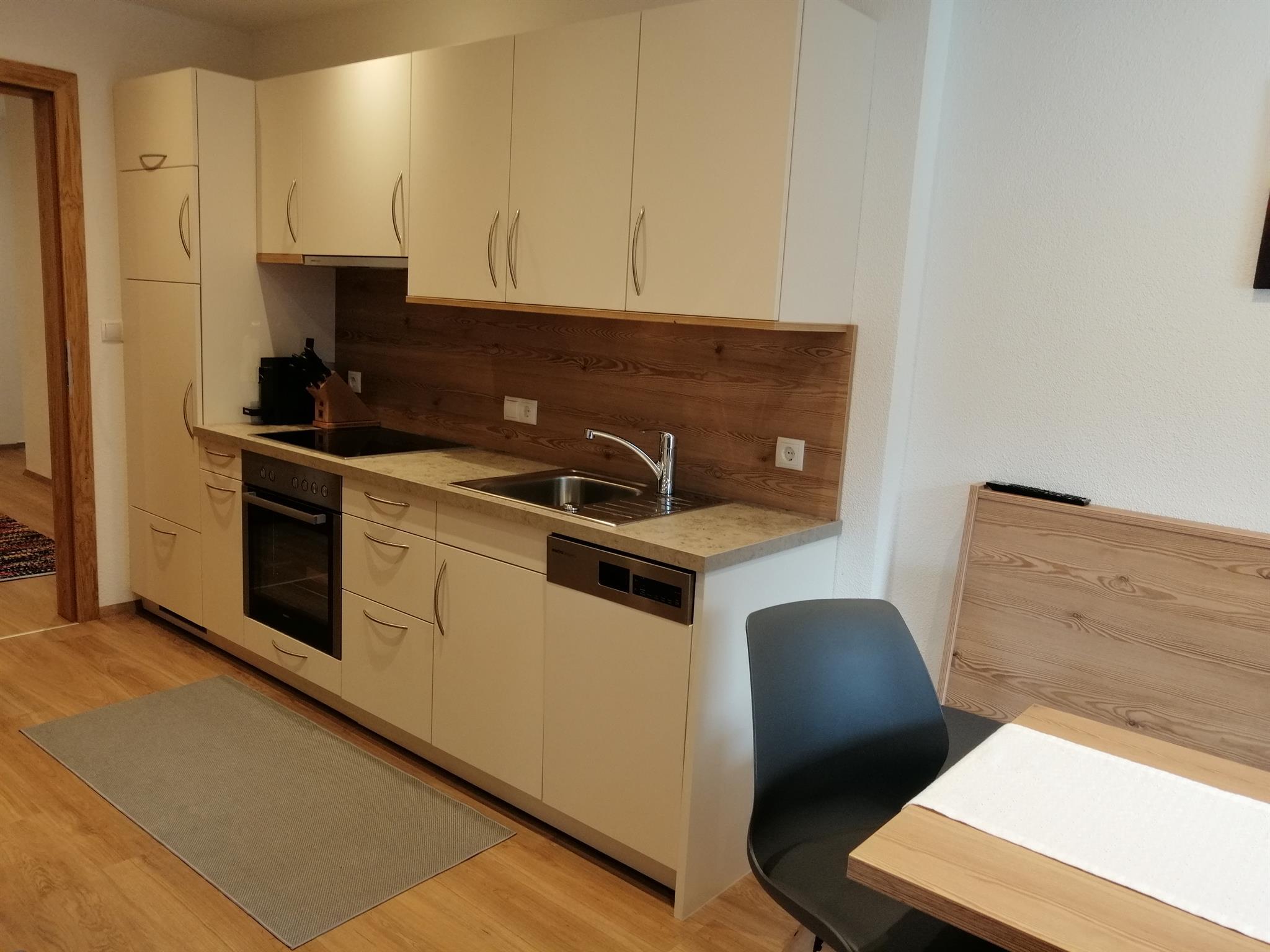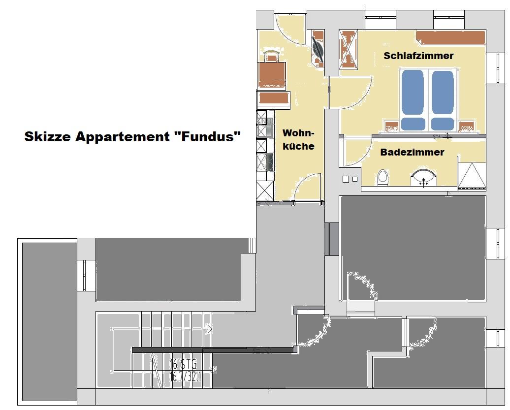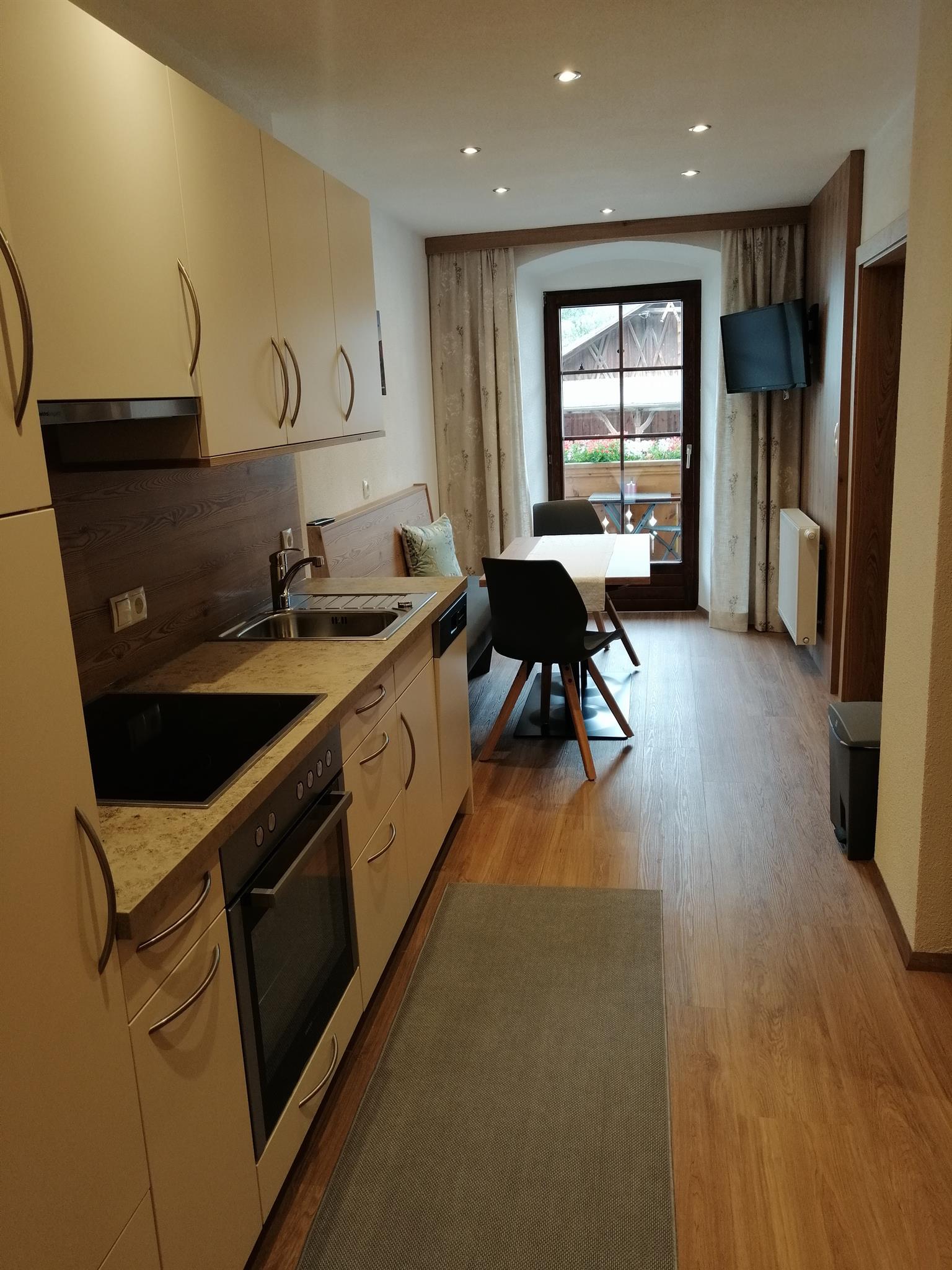 Appartement Fundus mit ca. 30 m²: ein Doppelzimmer, ein Wohnraum mit einer voll ausgestatteten Küchenzeile (Spülmaschine, Cerankochfeld, Backofen, Kühlschrank, Kaffeemaschine (Filter oder Kapseln - Cremesso), Wasserkocher, Toaster uvm.), Essecke und Balkon; ein Badezimmer mit Dusche/WC, Fußbodenheizung, Handtuchtrockner und Haartrockner.