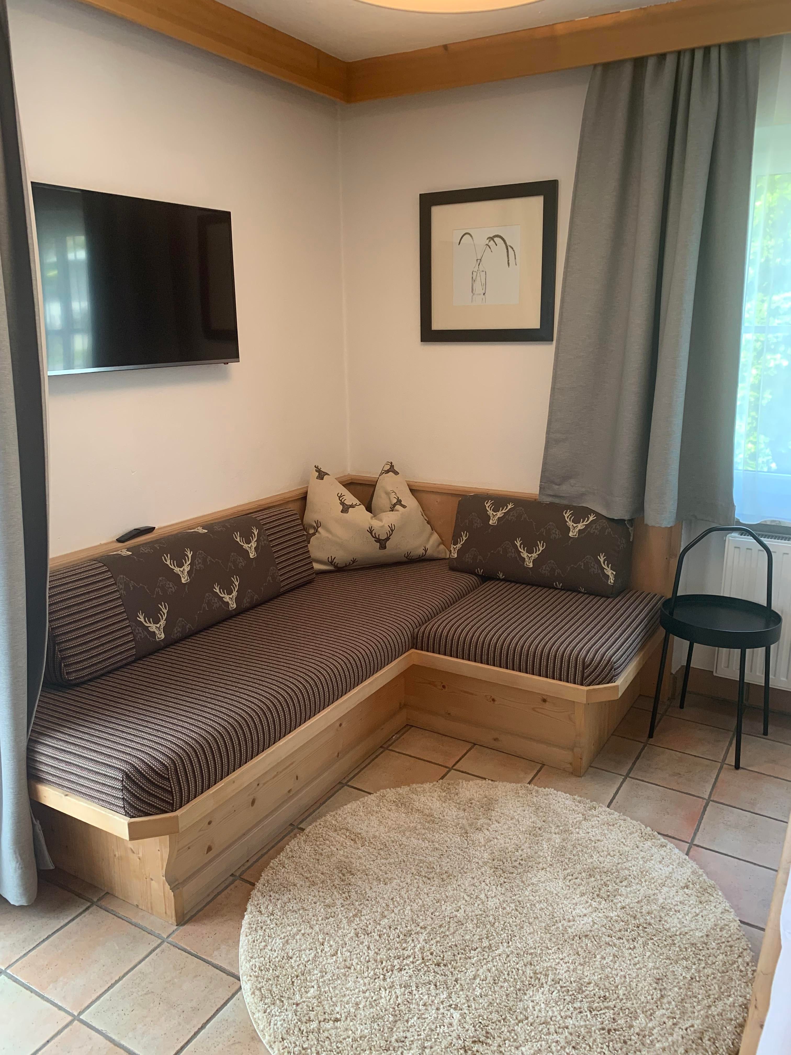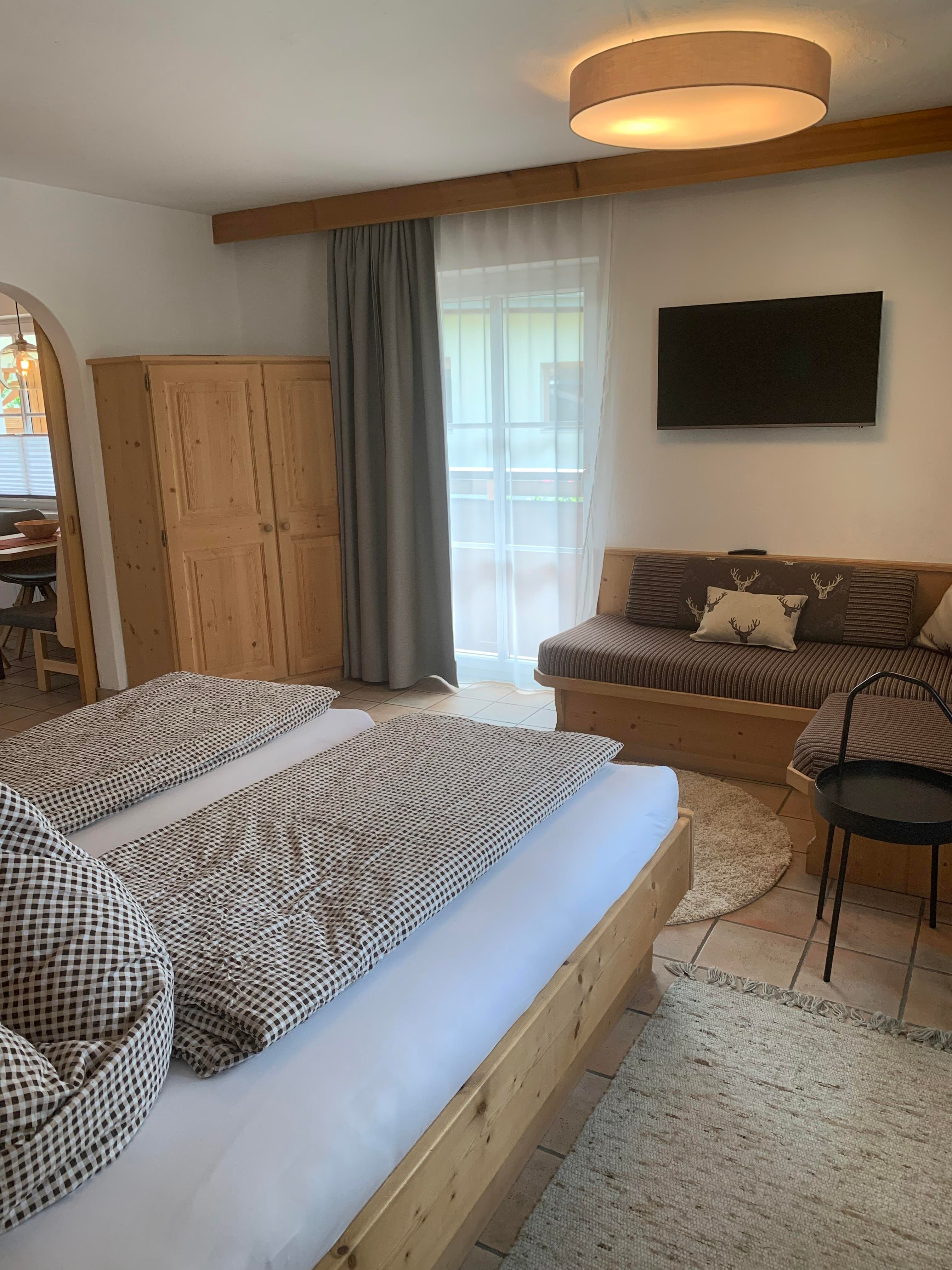 Unser Apppartement A1 für 2 Personen (ca. 30 m²) ist mit Holzmöbeln ausgestattet und verfügt über: 1 Wohn-Schlafzimmer mit Doppelbett und kleiner Sitzecke, SAT-Flat-TV, Badezimmer mit DU/WC und Föhn. Die separate Küche mit Eckbank ist mit Kühlschrank, Herd mit Ceranfeld und Backofen, Geschirrspüler, Nespresso-Kaffemaschine, Wasserkocher, Mikrowelle, Safe eingerichtet. Ein abgetrennter Balkonanteil mit Balkonmöbel lädt zum gemütlichen Sonnen und Entspannen ein.