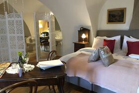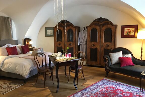 Das geräumige Romantikzimmer des goldenen Ankers verfügt über Badewanne, WC, Flatscreen-Kabel TV, Minibar, Wasserkocher, Safe, Föhn, Telefon und Wifi.