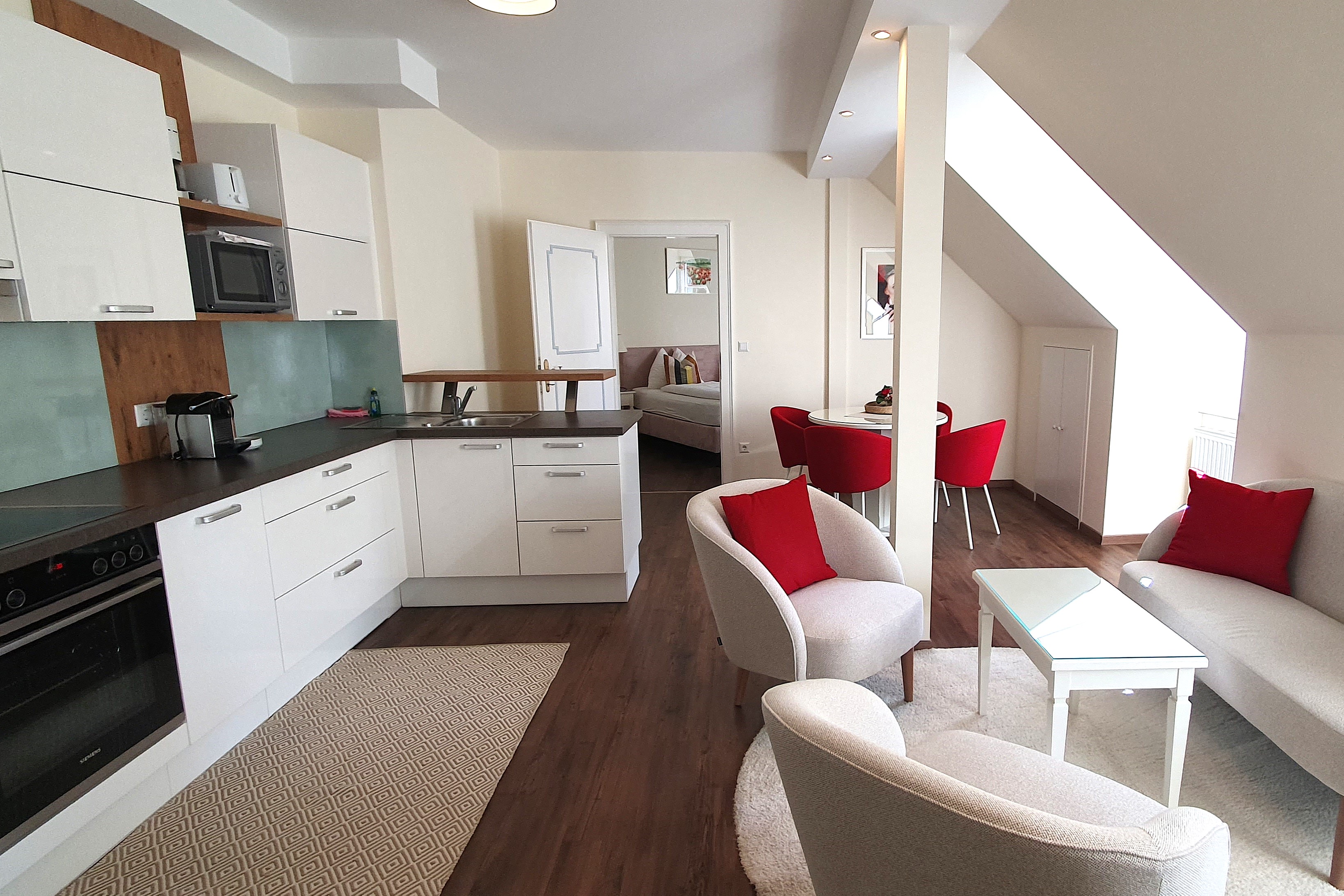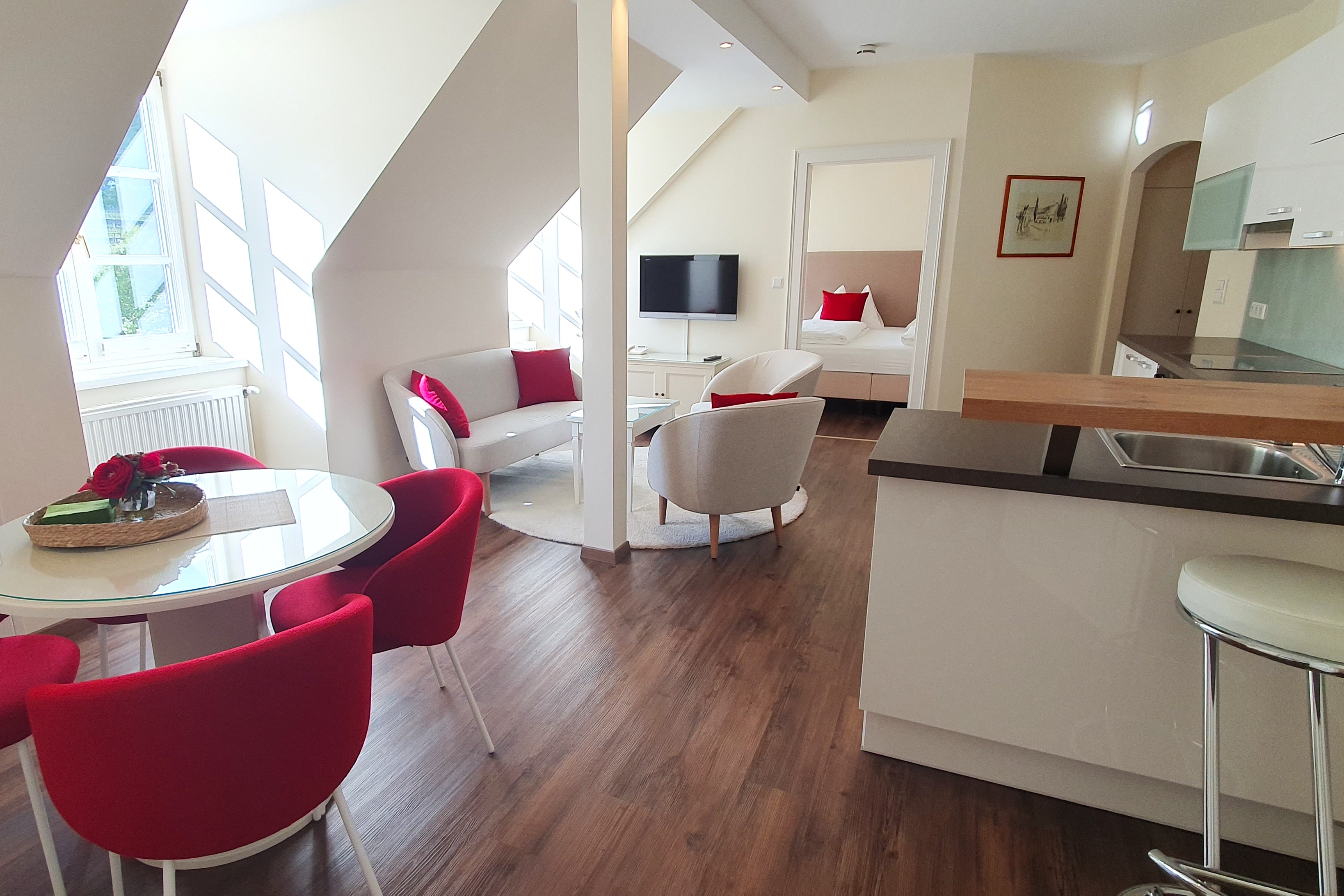 Zur Einrichtung gehören ebenso ein flat TV, ein Telefon und ein Safe. Die Ferienwohnung bietet herrlichen Weitblick auf die berühmten Spitzer Weinterrassen und die historische Pfarrkirche.