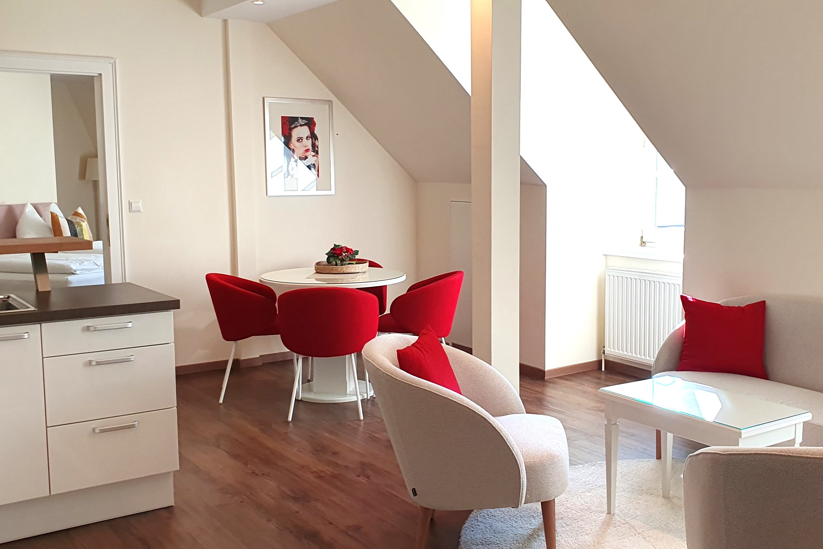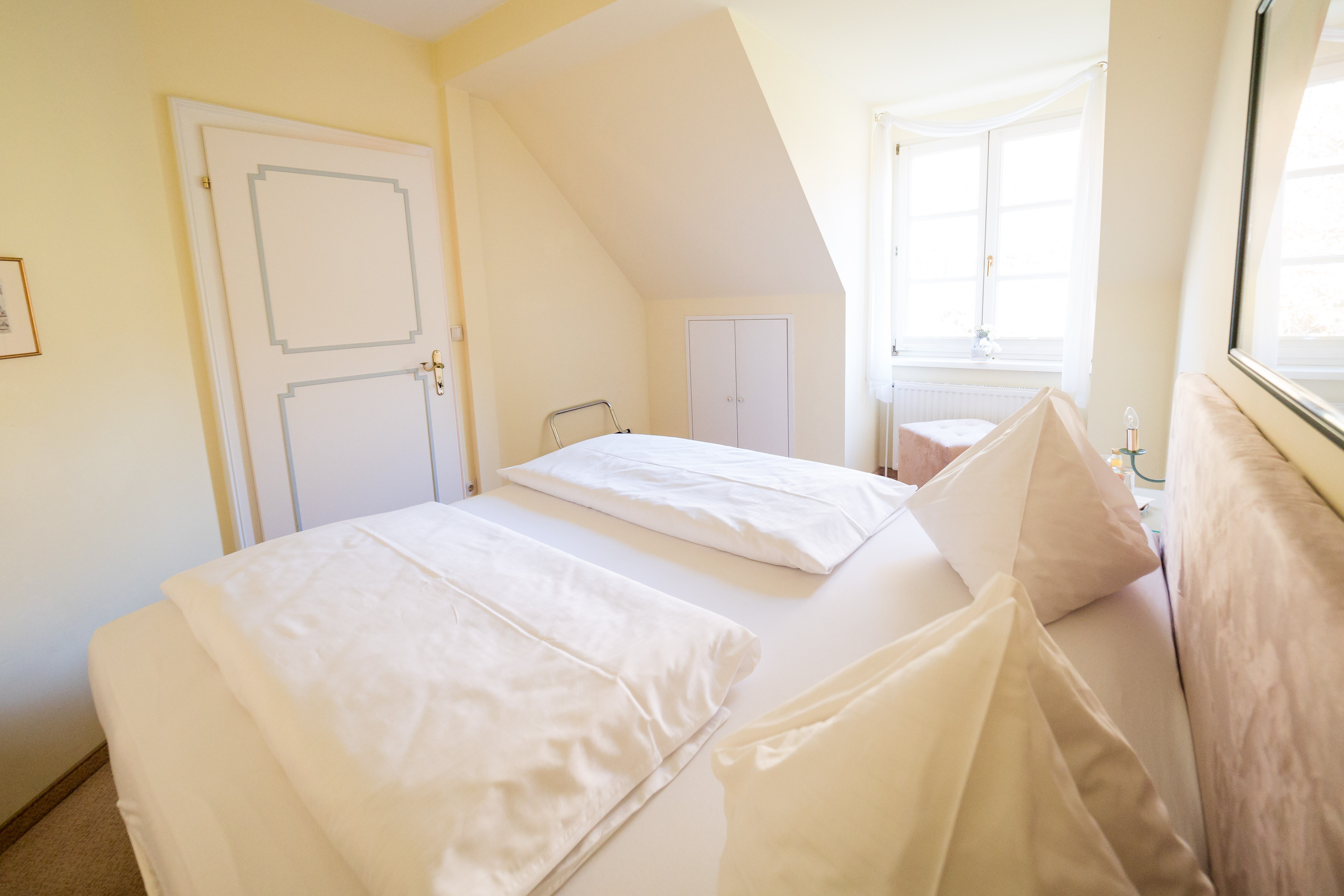 Die Unterkünfte reichen von luxuriös gestalteten Superior Doppelzimmern im Neo-Barockstil bis hin zu gemütlich eingerichteten Gästezimmern und großzügigen Appartements mit Blick auf Kirche und Weinberge.