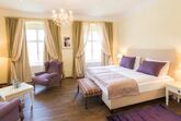 Die Unterkünfte reichen von luxuriös gestalteten Superior Doppelzimmern im Neo-Barockstil bis hin zu gemütlich eingerichteten Gästezimmern und großzügigen Appartements mit Blick auf Kirche und Weinberge.