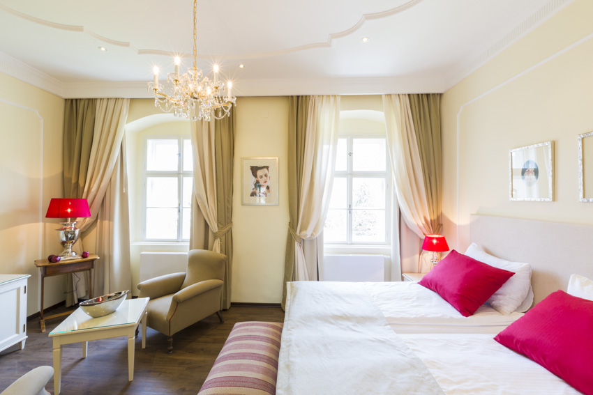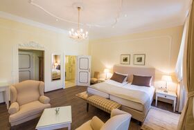 Die Unterkünfte reichen von luxuriös gestalteten Superior Doppelzimmern im Neo-Barockstil bis hin zu gemütlich eingerichteten Gästezimmern und großzügigen Appartements mit Blick auf Kirche und Weinberge.