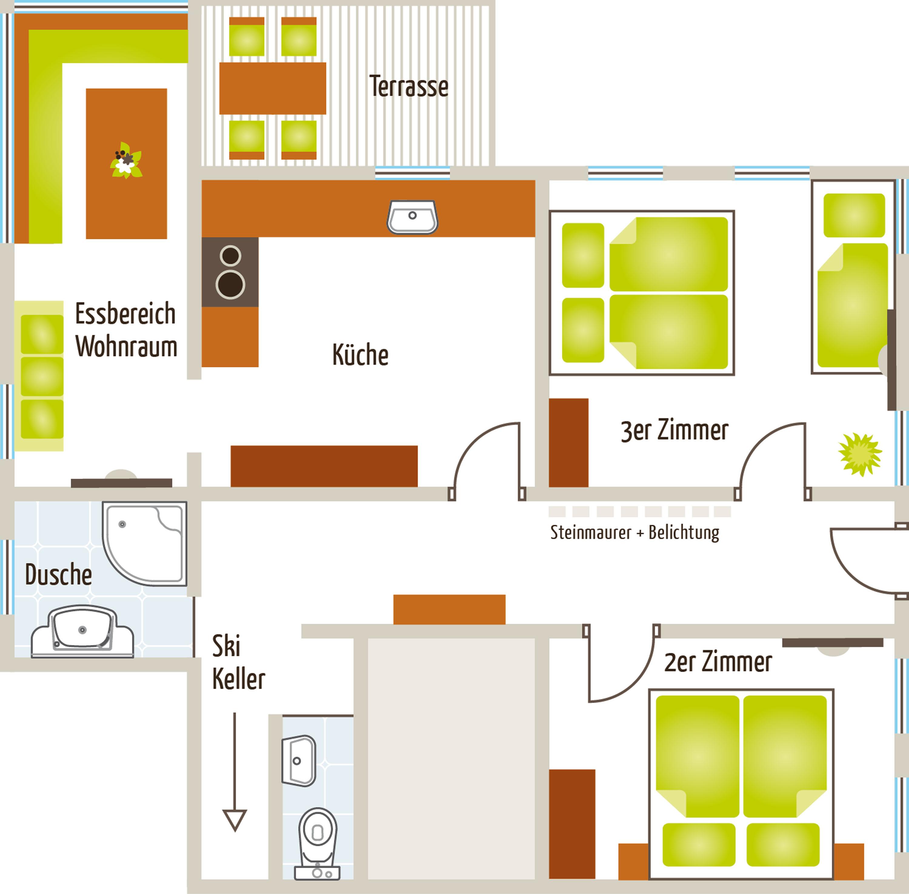 Das geräumige Appartement Blockkogel (75 m²) befindet sich im Erdgeschoss und hat 1 Doppelzimmer und 1 Dreibettzimmer (jeweils mit Sat-TV) und ein Bad mit Dusche und einem separates WC. Eine komplett ausgestattete Küche mit Geschirrspüler inkl. separaten Essbereich steht Ihnen zur Verfügung. Terrasse im Garten. Möglichkeit zum grillen.