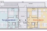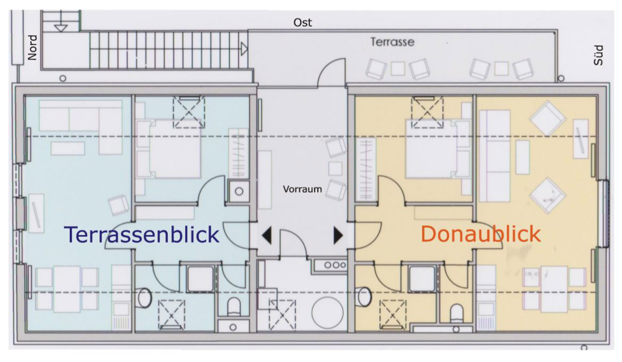 • Donaublick und Loibenbergblick (je ca. 50 m², getrennte Schlafzimmer, Wohnbereich mit Schlafsofa, Küchenzeile, Bad, WLAN, Fernseher & Zugang zur Terrasse).
