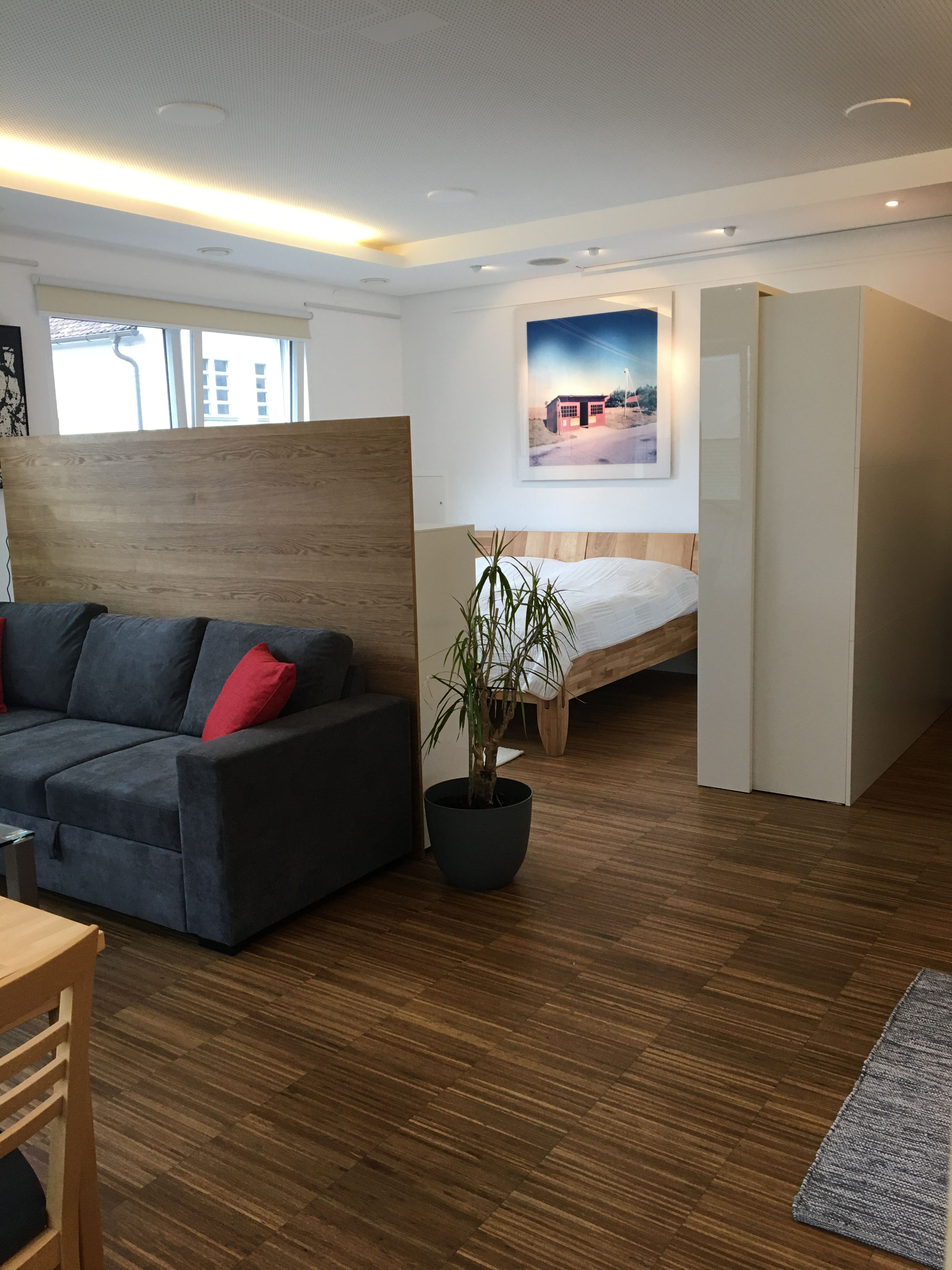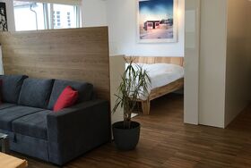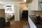 Neue, ebenerdig gelegene, geräumige, helle lichtdurchflutete Loftwohnung mit 52m². Durch einen Vorraums betreten Sie den hellen 42 m² großen Raum. Hinter dem geräumigen Schiebetürschrank befindet sich das bequeme Vollholz-Doppelbett (180/200cm). Links von Ihnen befindet sich eine wunderschöne Küchenzeile (weiß/matt). Inklusive Geschirrspüler. Zwei Kommoden sind im Raumteiler inkludiert. Dahinter befindet sich eine gemütliche, ausziehbare Couch (KabelTV, WLAN). Eine Sitzgruppe (für 4 Pers.) bildet den Abschluß des Raumes. Dusche und WC sind räumlich getrennt.