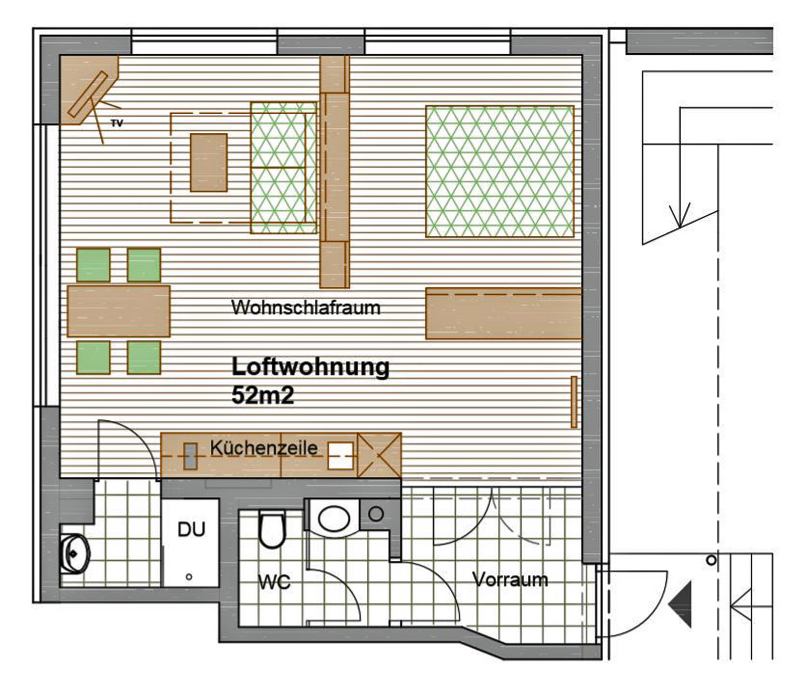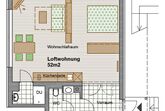 • Loftwohnung (ca. 53 m²) mit offenem Raumkonzept, Küchenblock mit Geschirrspüler sowie eigener Terrasse im Innenhof