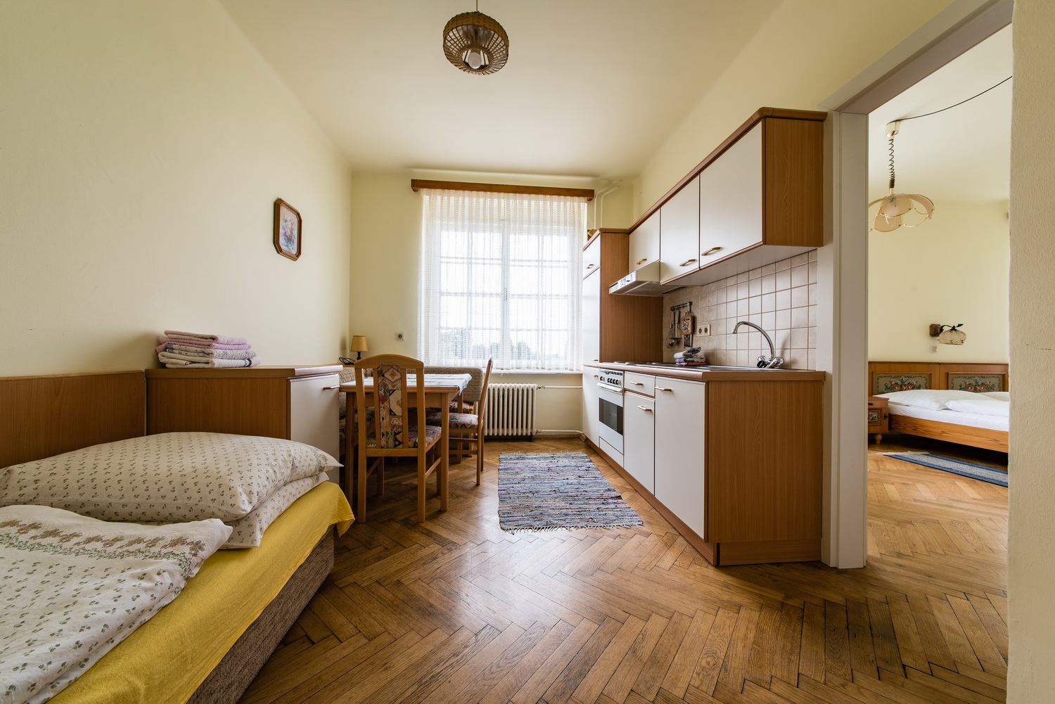 Die helle Ferienwohnungen Fritz (ca.36 m²) ist für drei Personen ausgelegt. Im schönen, lichtdurchfluteten Schlafzimmer steht ein bequemes Doppelbett sowie ein SAT-TV. Das Bad besteht aus Dusche und WC. Die vollausgestattete Wohnküche mit Backofen, Kühlschrank und Herd lädt zum Kochen ein. In der Wohnküche steht des Weiteren eine Eckbank mit Esstisch und Stühlen sowie ein Einzelbett.
