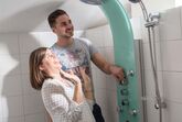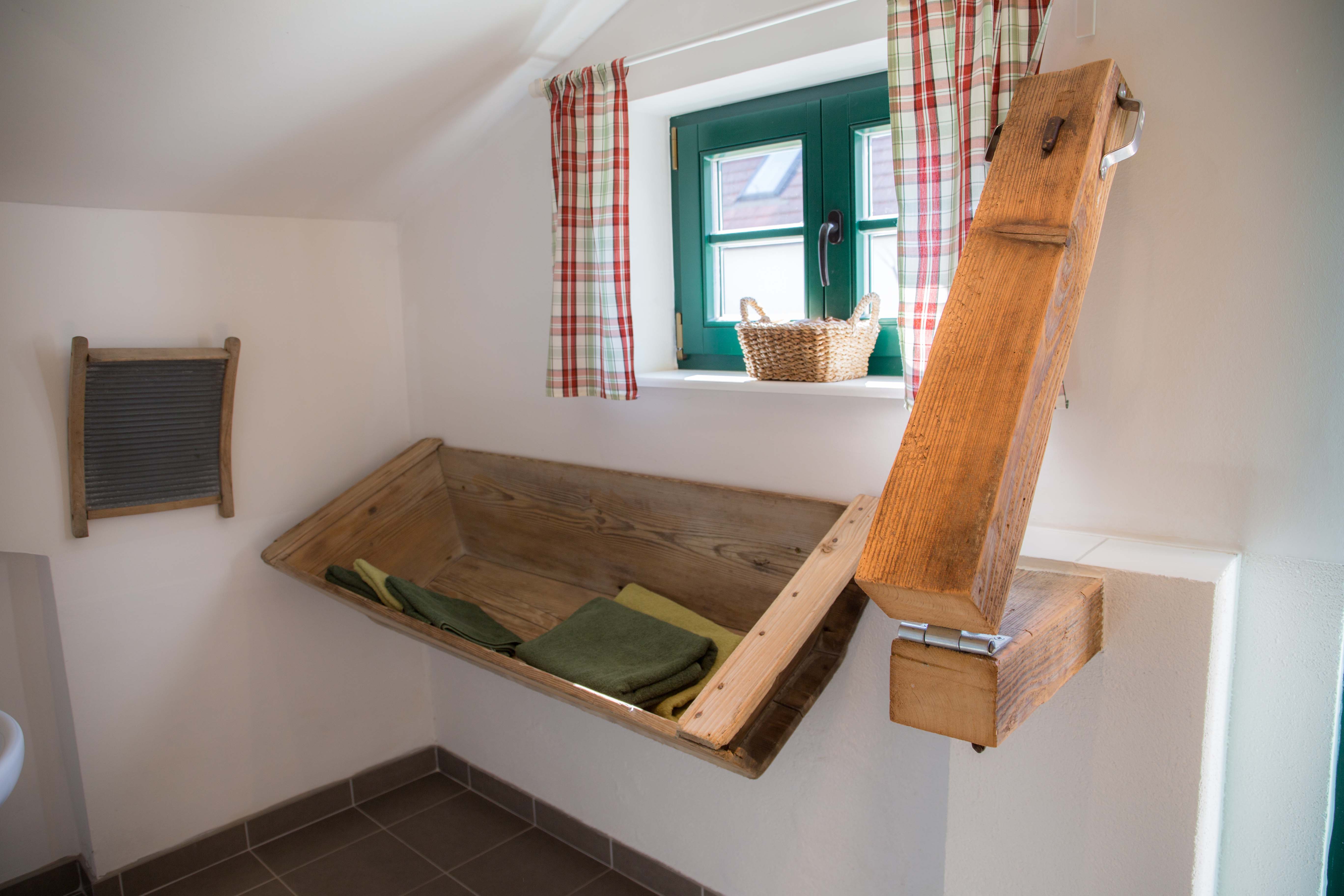 das urige Badezimmer mit Waschtrog und Romantik-Dusche