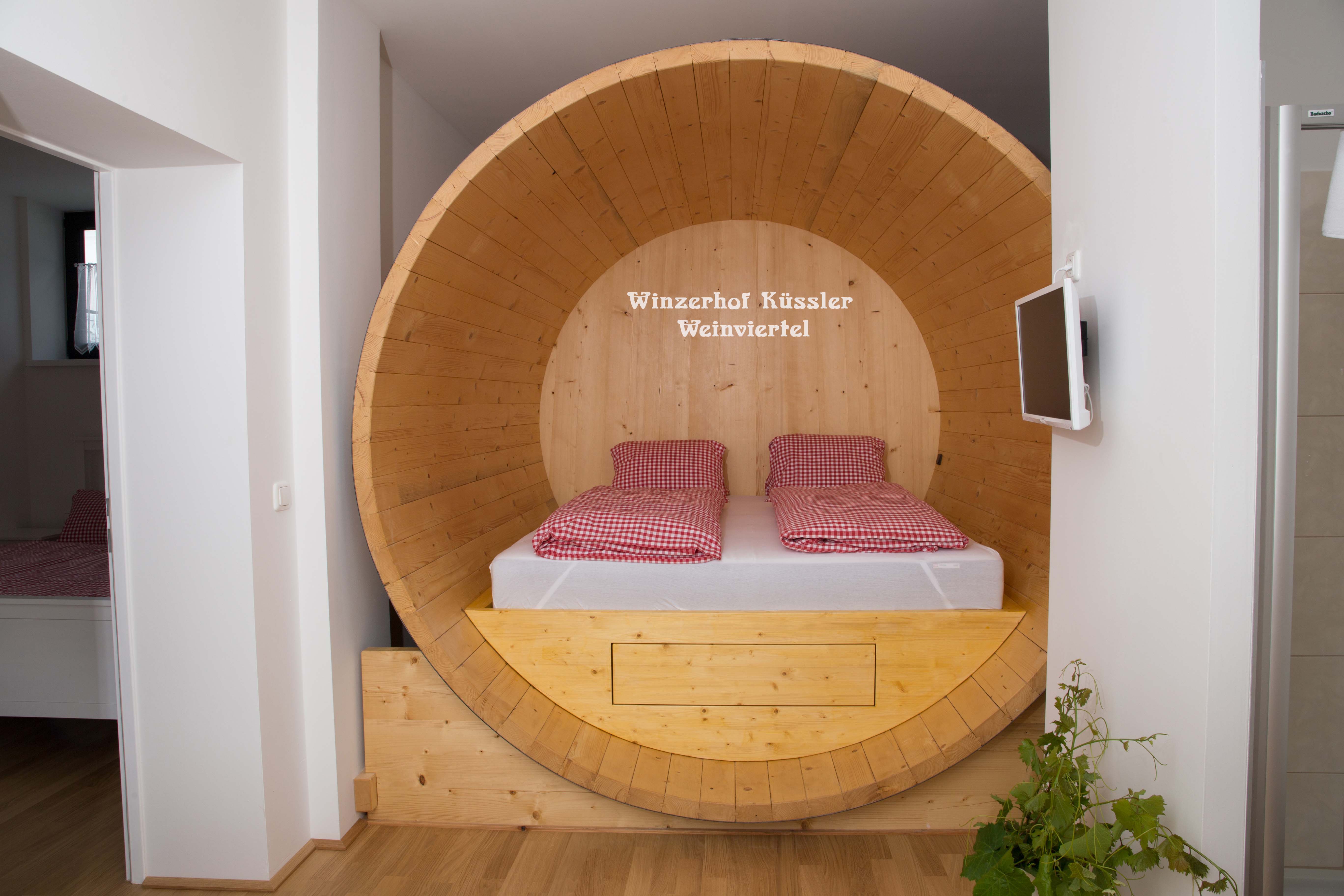 So etwas ist einzigartig - so etwas gibt es nur bei uns. Schlafen in der Weinfass-Suite. Schon die Vorderfront dieser Suite ist einem Weinfass nach empfunden. Kaum machen Sie jedoch die Tür des Fasses präsentiert sich ein 9000 Liter Originalweinfass. In diesem Fass werden Sie garantiert eine himmlische Nacht verbringen. Dank der einzigartigen Atmosphäre des brickelden Weinfasses.