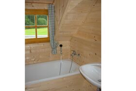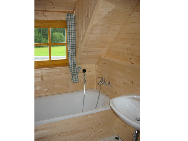 Im Wohnzimmer ist ein Schlafsofa für die 7.Person. Im Obergeschoss Bad mit Badewanne und WC. Im Untergeschoss kleines Bad mit Dusche. WC separat.