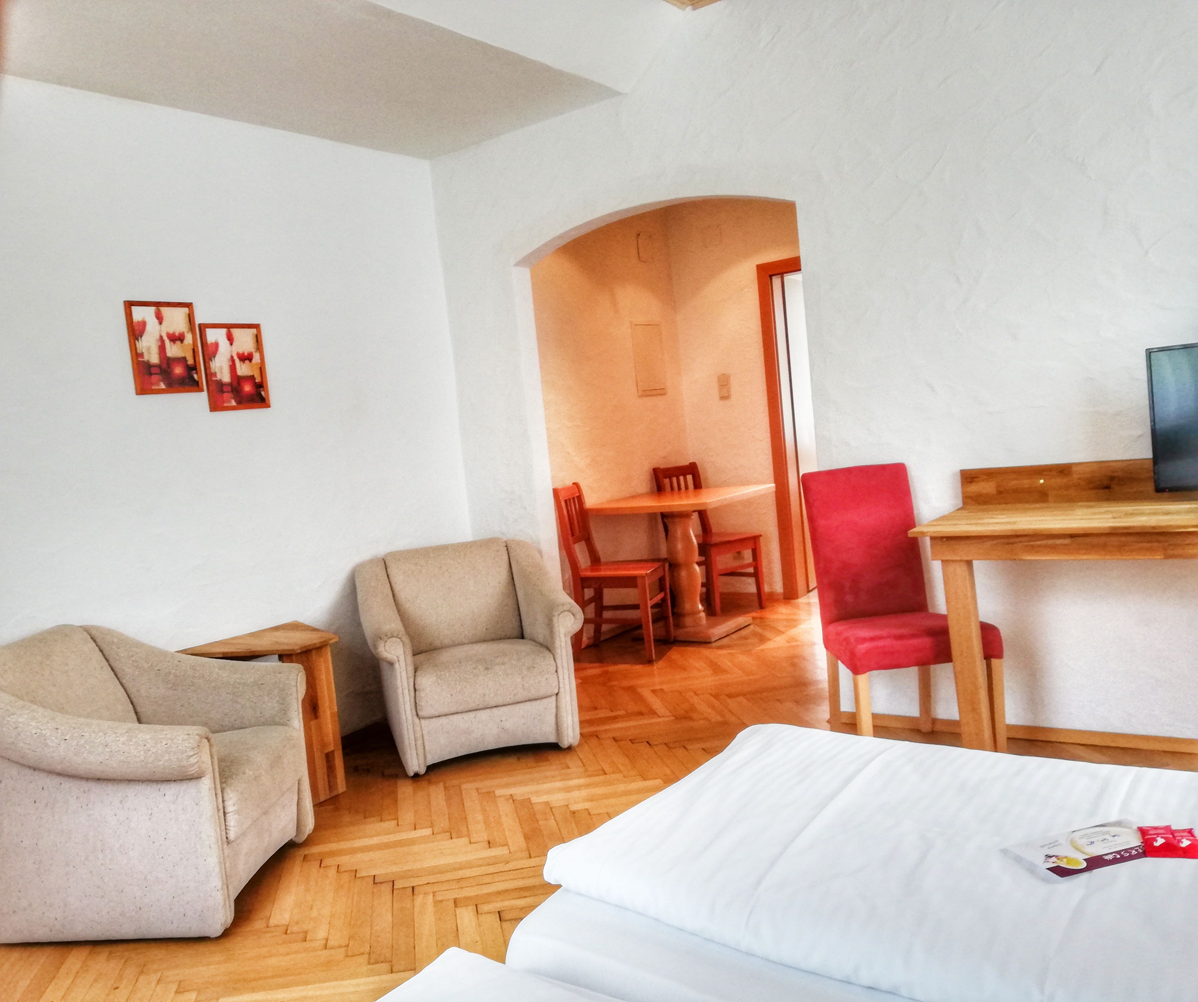 Das großzügig ausgestattete Familienzimmer für 5 Personen verfügt über eine Fläche von rund 60 m² und ist mit TV, gratis W-Lan und Schreibtisch ausgestattet. Bad und WC getrennt, das Bad ist mit einer Badewanne ausgestattet. Fön und Handtücher sind selbstverständlich vorhanden.