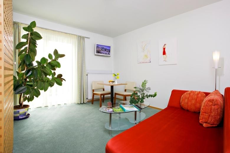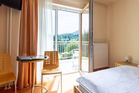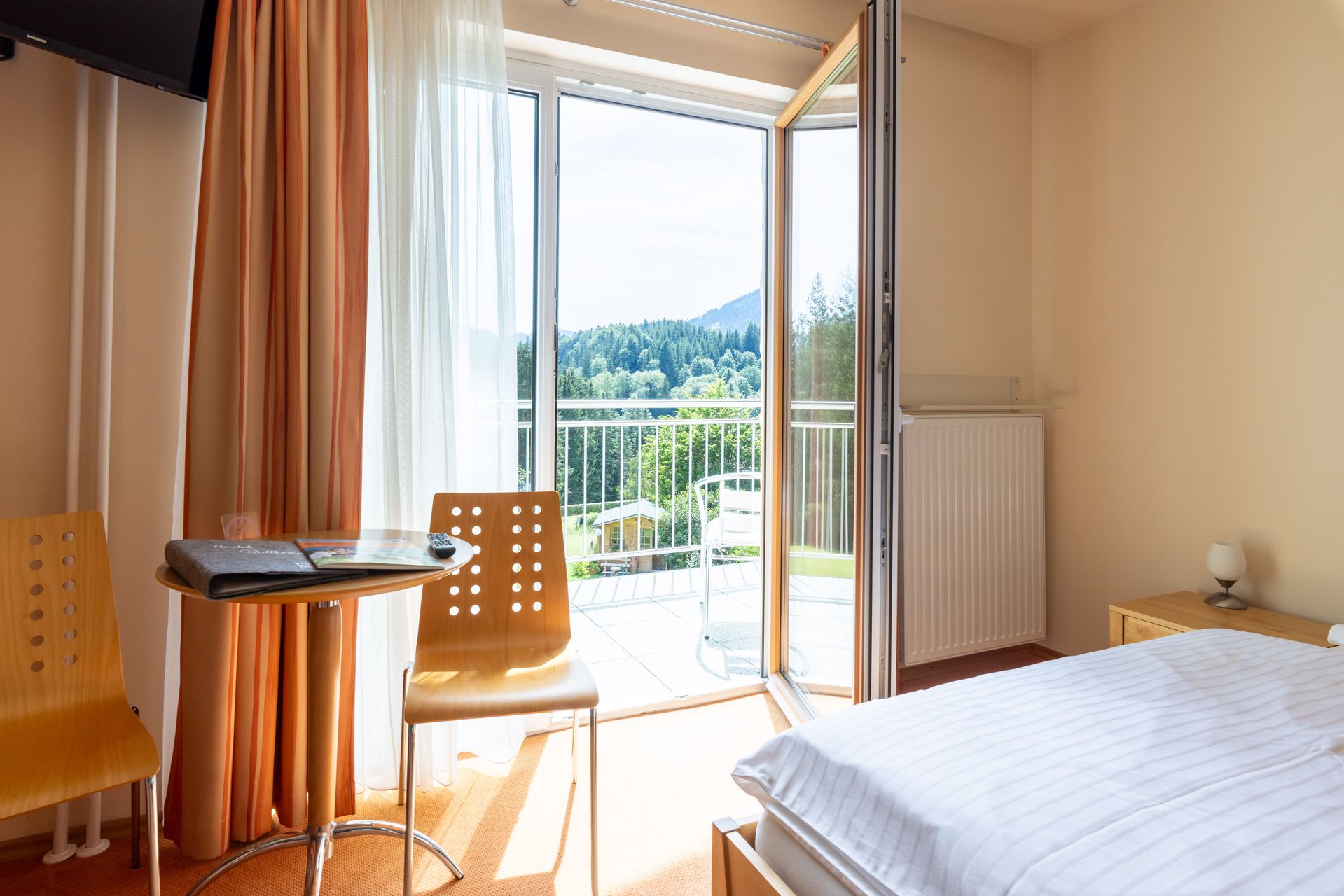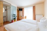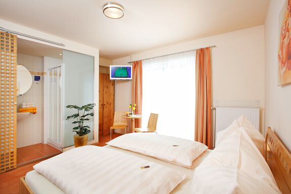 Das moderne Doppelzimmer samt Loggia ist sehr hell und freundlich eingerichtet. Das Nichtraucherzimmer ist mit einem Doppelbett und einem Balkon ausgestattet. Zudem sind Flat-TV inkl. SAT-Anschluss, ein Tisch mit Sesseln und ein Zimmersafe vorhanden. Das geräumige Badezimmer verfügt über Dusche und WC.