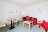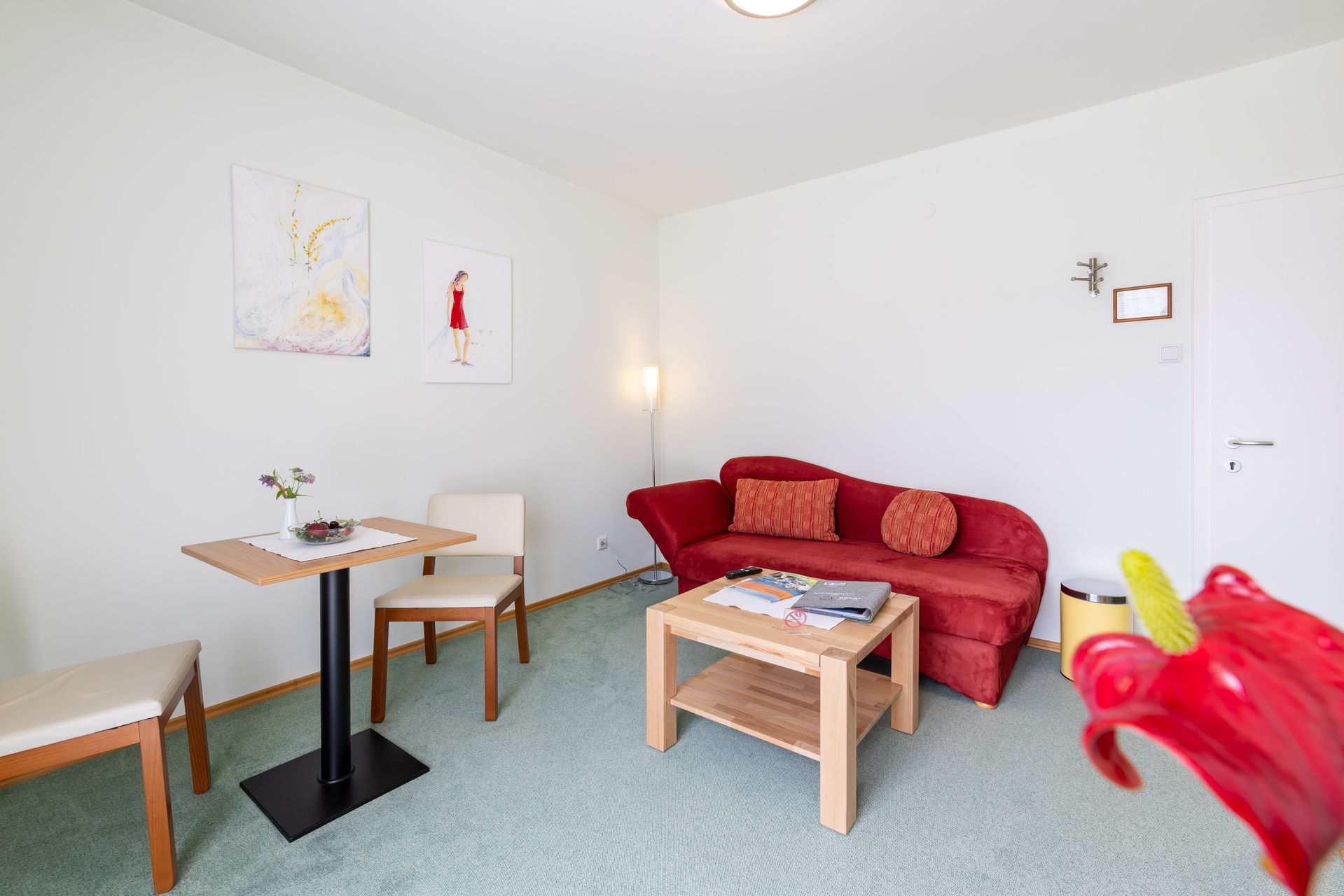 Die Suite inkl. Loggia, Balkon und kleinem Vorraum umfasst rund 36m² und ist sehr freundlich und gemütlich ausgestattet. Im Wohnbereich befindet sich ein Tisch mit Sesseln sowie eine ausziehbare Couch für gemütliche Stunden. Flat TV inklusive SAT-Anschluss sowie ein Zimmersafe und Kühlschrank sind vorhanden. Das geräumige Badezimmer ist mit Dusche und WC ausgestattet.