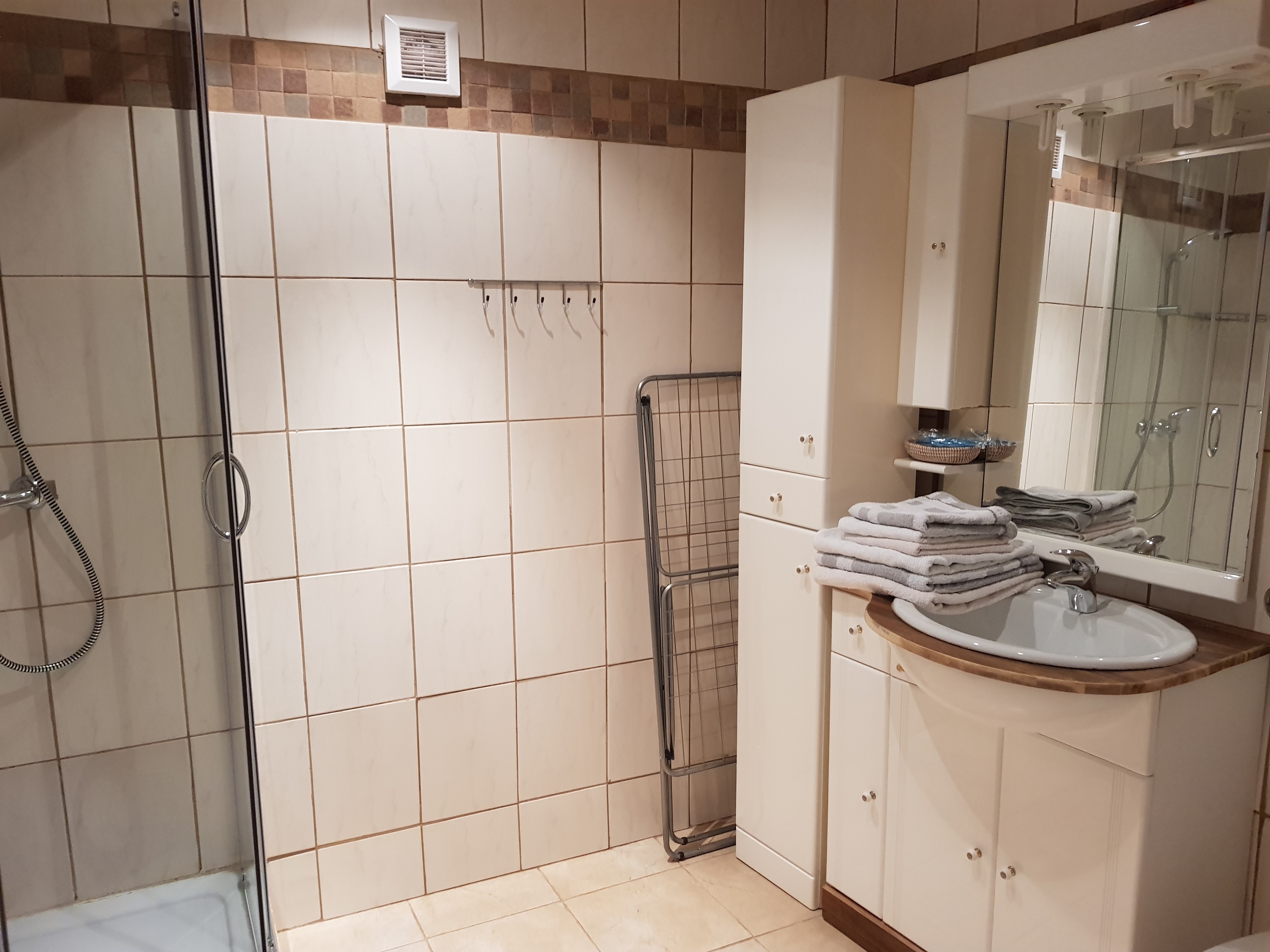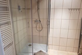 Im Badezimmer mit Dusche sind Pflegeartikel wie Duschgel, Seife und natürlich auch ein Föhn verfügbar. Ausreichend Handtücher, Hausschuhe und ab 3 Tagen Aufenthalt auch Bademäntel gehören mit zu unserer Standard-Ausstattung.