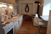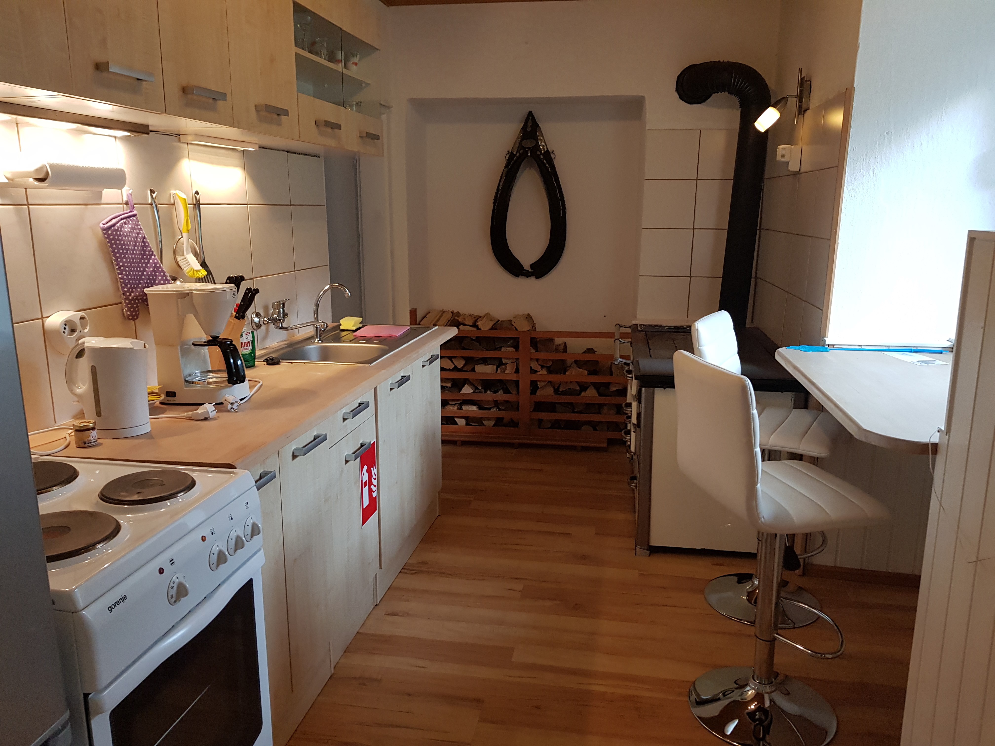 In der voll ausgestatteten Küche findest Du neben dem alten Holzofen auch einen E-Herd mit Backrohr und natürlich eine Kühl-Gefrierkombination (immer mit einer Flasche Begrüßungs-Sekt oder Prosecco gefüllt). Kaffeefilter-Maschine, Espressomaschine, Wasserkocher gehören ebenso zur Ausstattung wie ausreichend Töpfe, Pfannen und Geschirr.