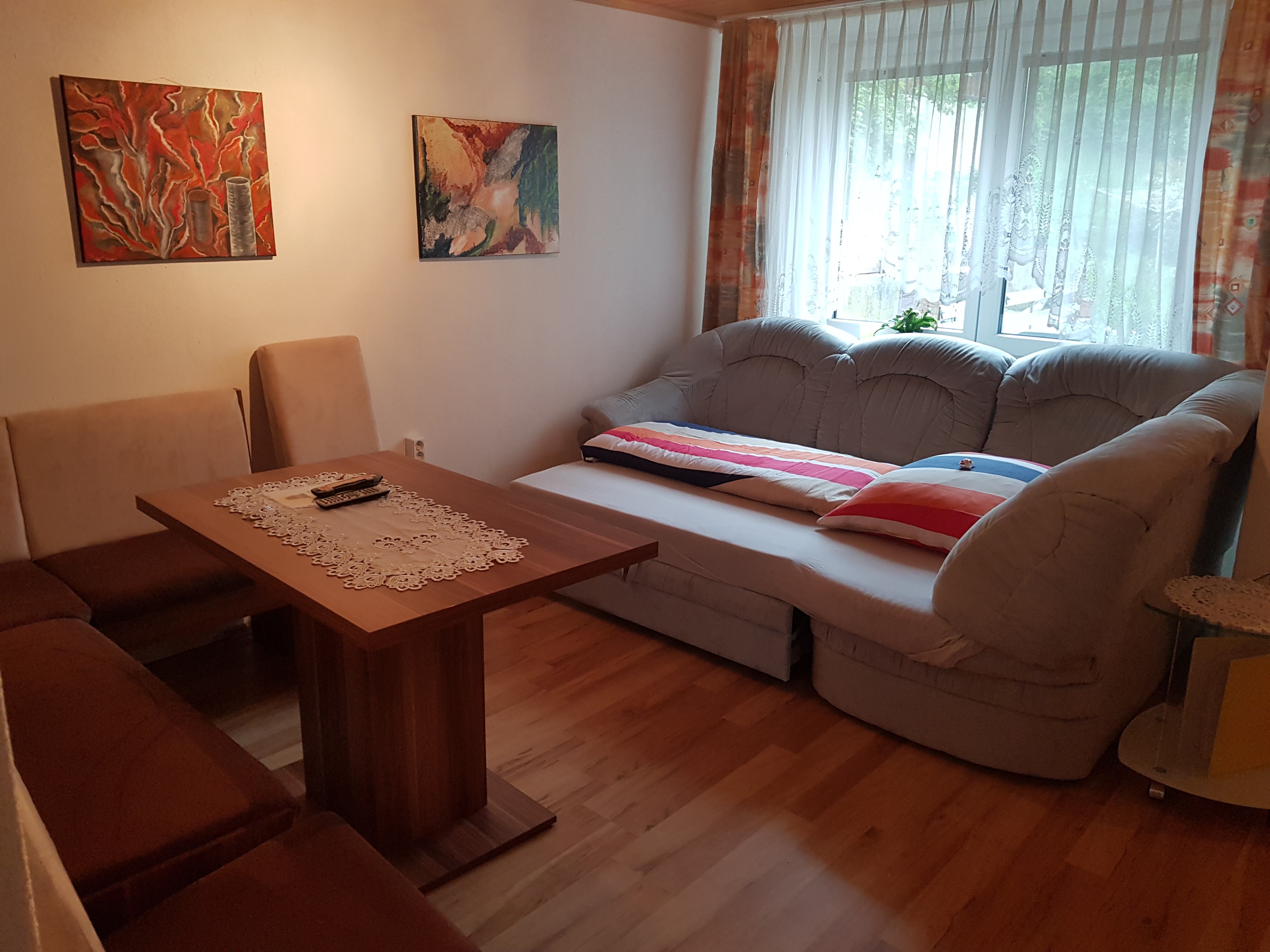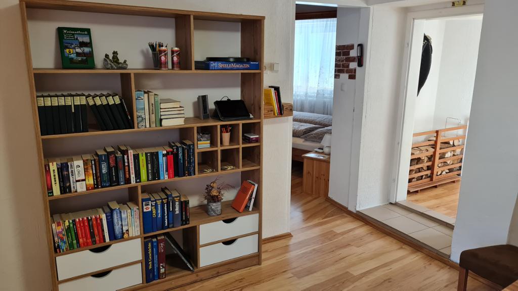 Im gemütlichen Wohnzimmer haben wir eine kleine Bibliothek eingerichtet. Kostenloses W-LAN und 2 x SAT-TV runden die Ausstattung ab.
