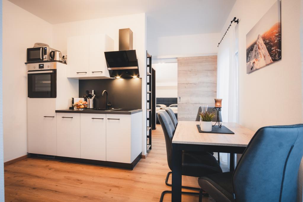 Das Appartement bietet eine voll ausgestattete, moderne Küche mit E-Herd, Backofen, Geschirrspüler, Mikrowelle, Nespresso Kaffeemaschine, Kühlschrank, Wasserkocher, Geschirr und Besteck.