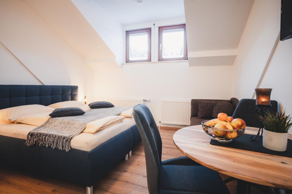 Unser Appartement Rauher Kamm bietet Platz für 4-5 Personen. Ein getrenntes Schlafzimmer mit Doppelbett und ein Wohn-/Schlafbereich mit Doppelbett und Schlafsofa. Beide Zimmer verfügen über FlatTVs, separate Badezimmer und WCs und sind mit Bettwäsche und Handtüchern ausgestattet. WLAN ist inkludiert.