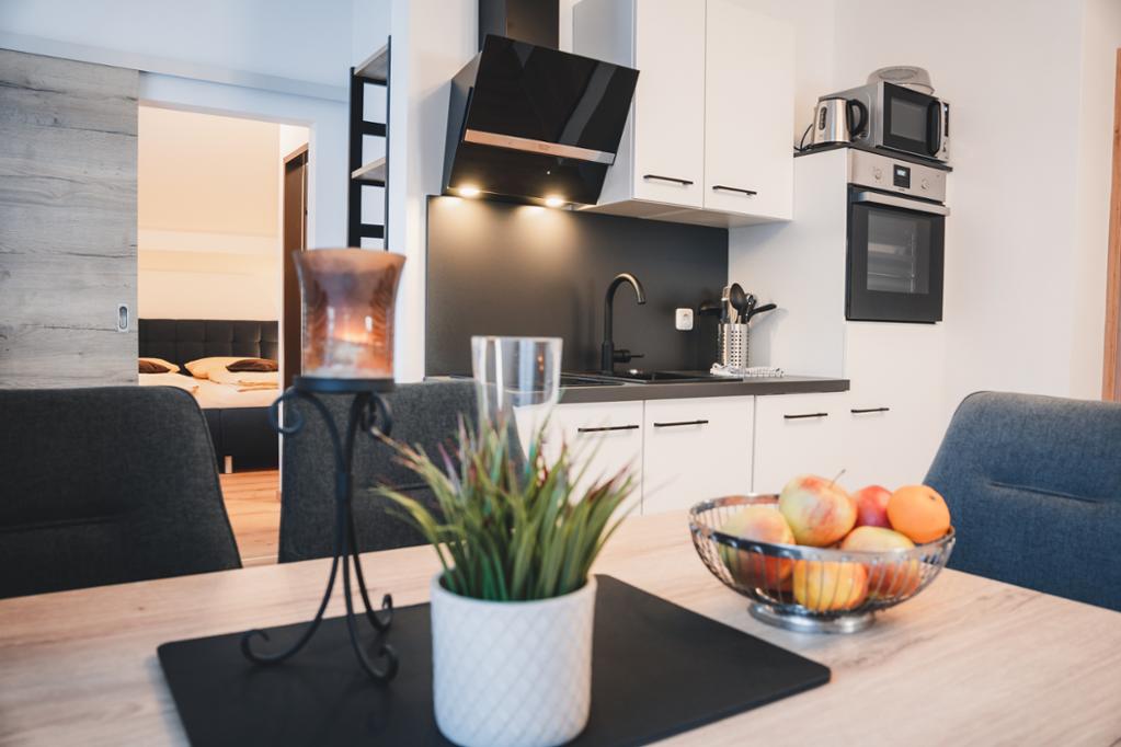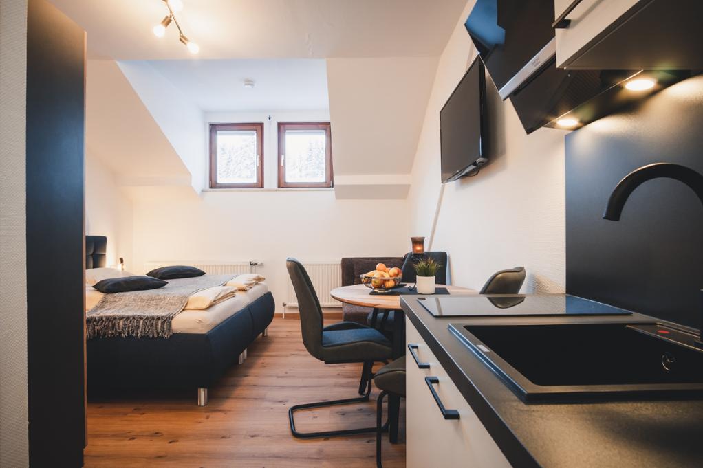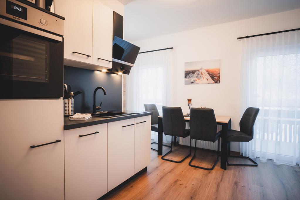 Das Studio bietet eine voll ausgestattete, moderne Küche mit E-Herd, Backofen, Geschirrspüler, Mikrowelle, Nespresso Kaffeemaschine, Kühlschrank, Wasserkocher, Geschirr und Besteck.