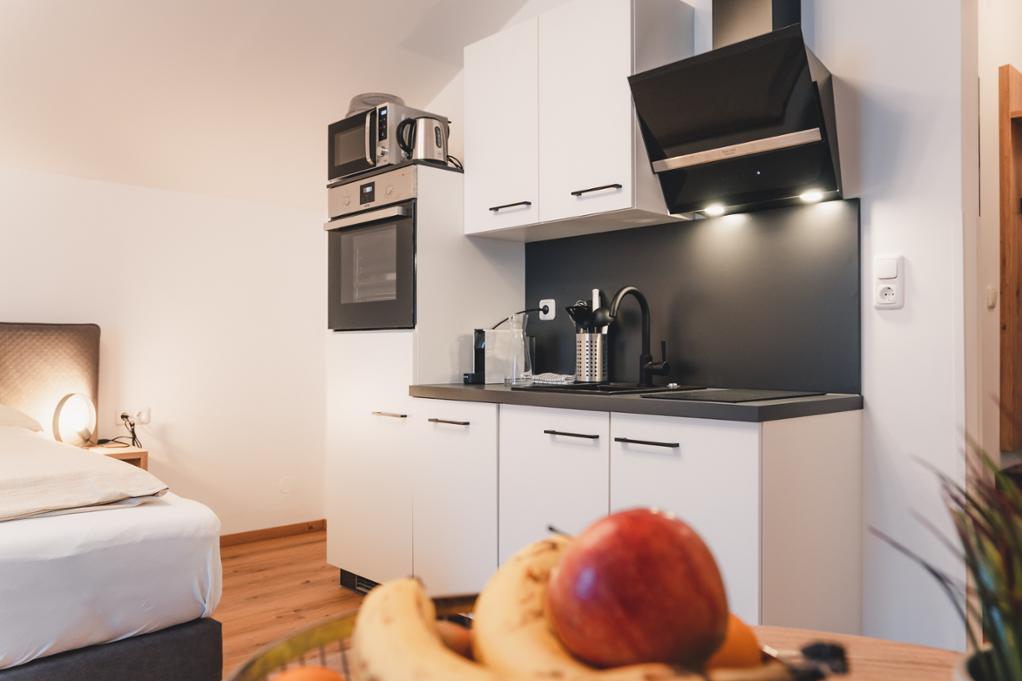 Das Studio bietet eine voll ausgestattete, moderne Küche mit E-Herd, Backofen, Geschirrspüler, Mikrowelle, Nespresso Kaffeemaschine, Kühlschrank, Wasserkocher, Geschirr und Besteck.