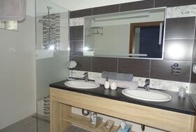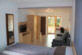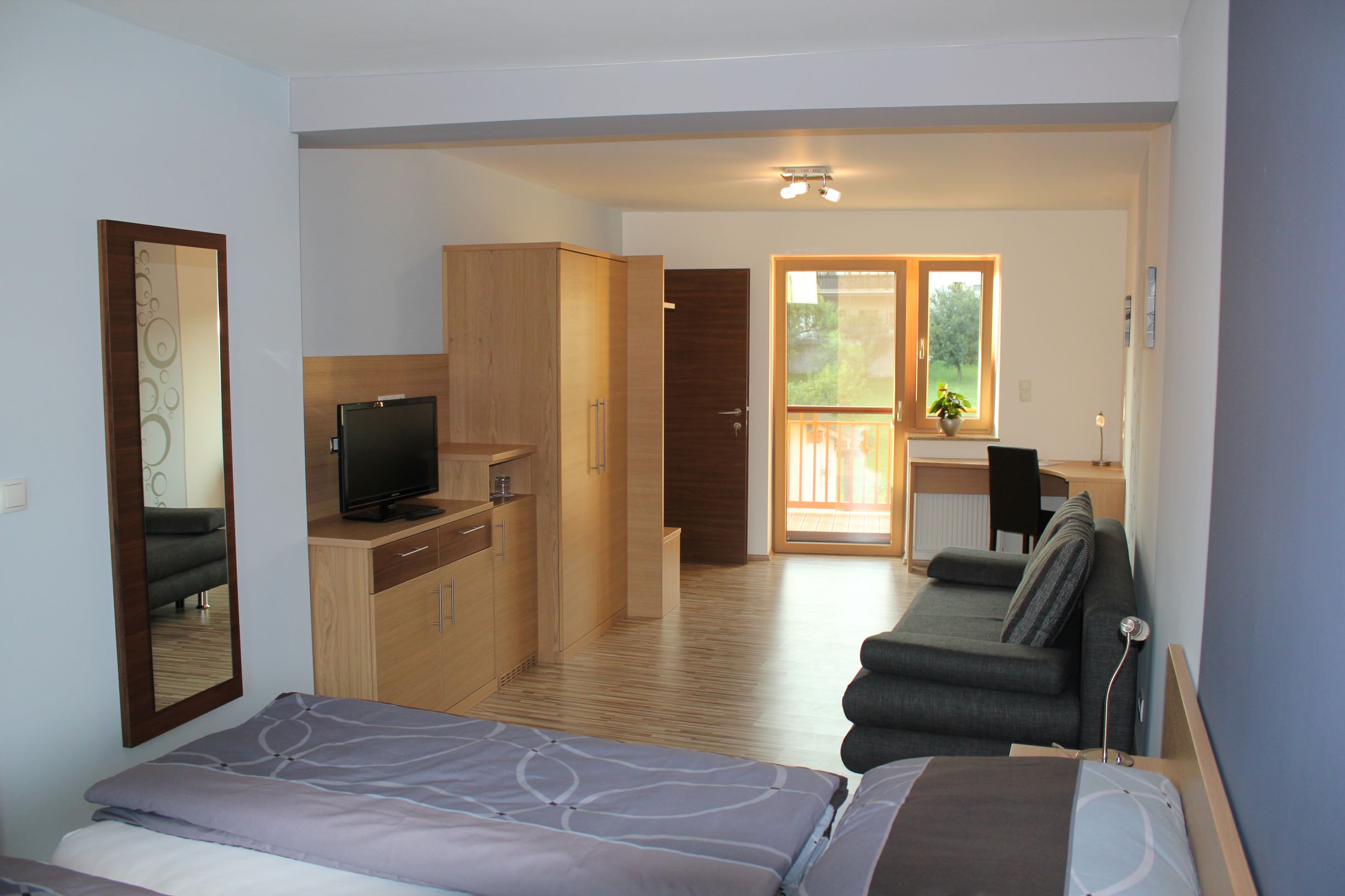 Dieses Zimmer verfügt zusätzlich zur Standardausstattung über ein Bettsofa, einen Schreibtisch mit Lampe, einen eigenen Balkon (Gartenblick) mit Sitzgelegenheit sowie einen Doppelwaschtisch im Badezimmer.
