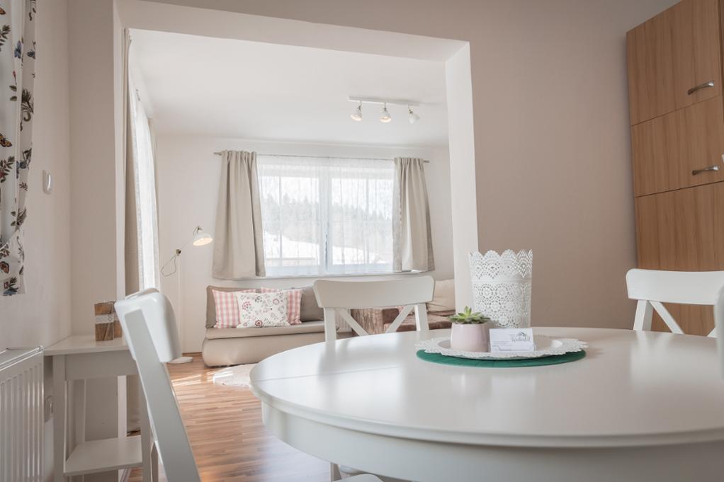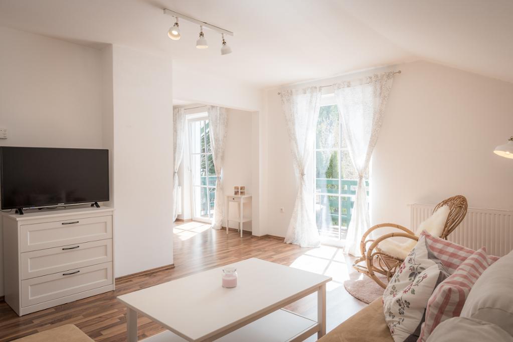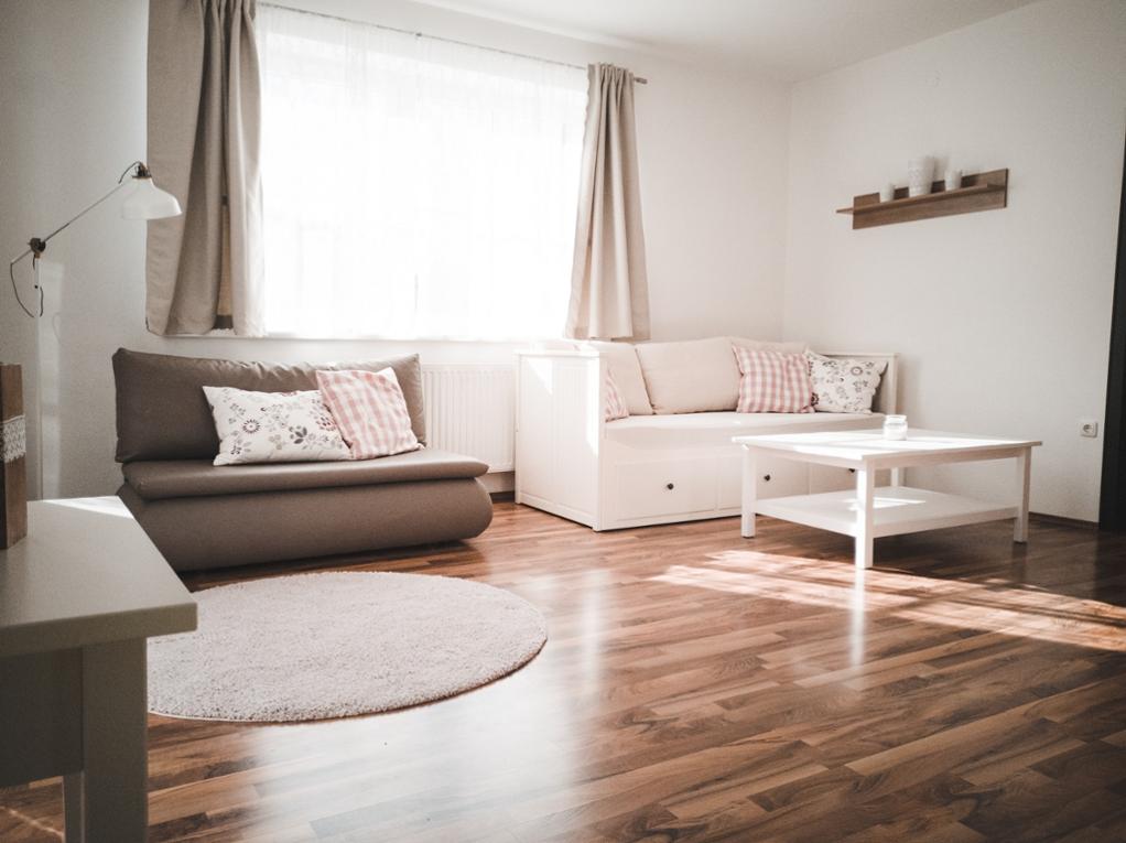 Weiters verfügt diese Wohnung über ein Wohn-Esszimmer sowie ein Schlafzimmer mit Doppelbett. Für die weiteren Personen stehen im Wohnzimmer zwei Schlafcouchen bereit.