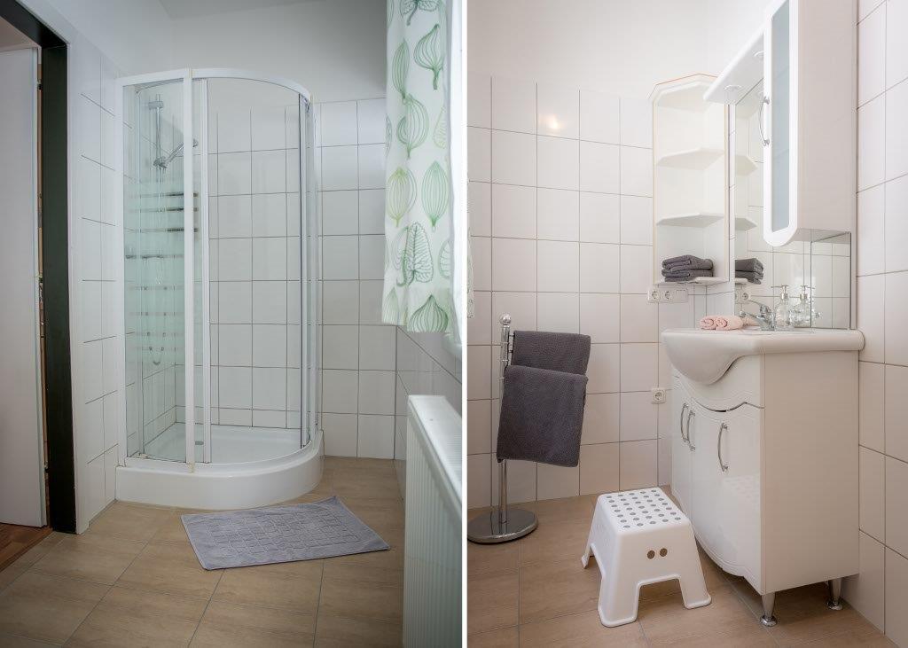 Das komplett ausgestattete eigene Bad bietet eine Dusche und einen Haartrockner, sowie einen Hocker für unsere kleinen Gäste. Handtücher werden selbstverständlich zur Verfügung gestellt.