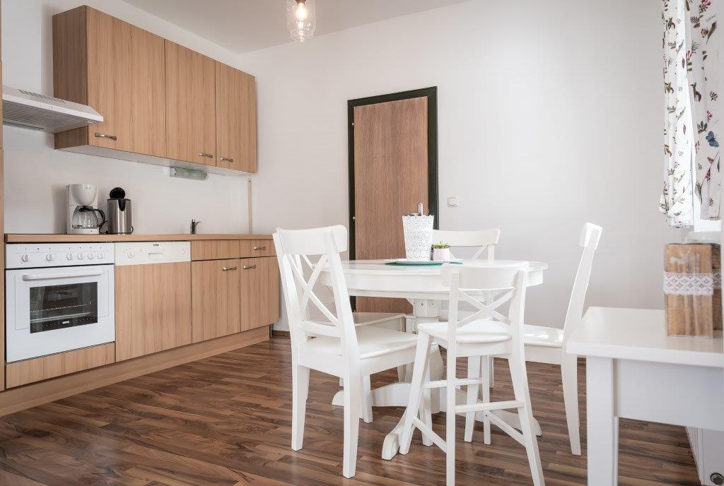 Die Wohnung verfügt über eine voll ausgestattete Küche mit einer Spülmaschine, einem Kühlschrank, einer Mikrowelle, einer Filterkaffeemaschine und einem Herd. Geschirrspülmittel, Spülmaschinentabs sowie Geschirrtücher werden zur Verfügung gestellt.