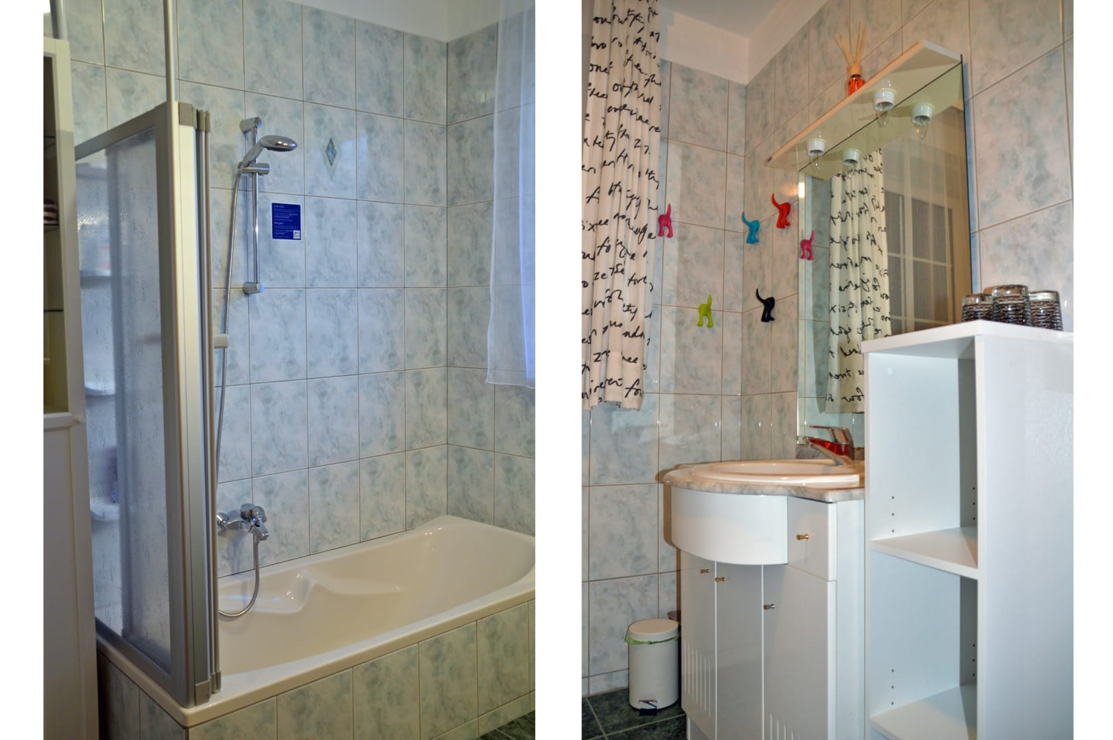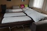 Die Wohnung besteht aus einer großen Wohn-Küche mit ausziehbarer Bank (integrierte Matratze) für 2 Personen, einem Schlafzimmer mit Doppelbett und zusätzlichem Schlafsofa, einem großen Badezimmer mit Badewanne inkl. Dusche und Waschmaschine, einer seperaten Toilette, einem großen Schrankraum und einem Abstellraum im Eingangsbereich.