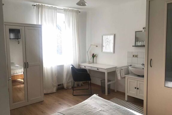Unsere drei renovierten Gästezimmer, davon zwei Doppelbettzimmer und ein Einbettzimmer, sind in weiß und Naturtönen gehalten und bieten einen ruhigen Rückzugsort nach einem ereignisreichen Tag.