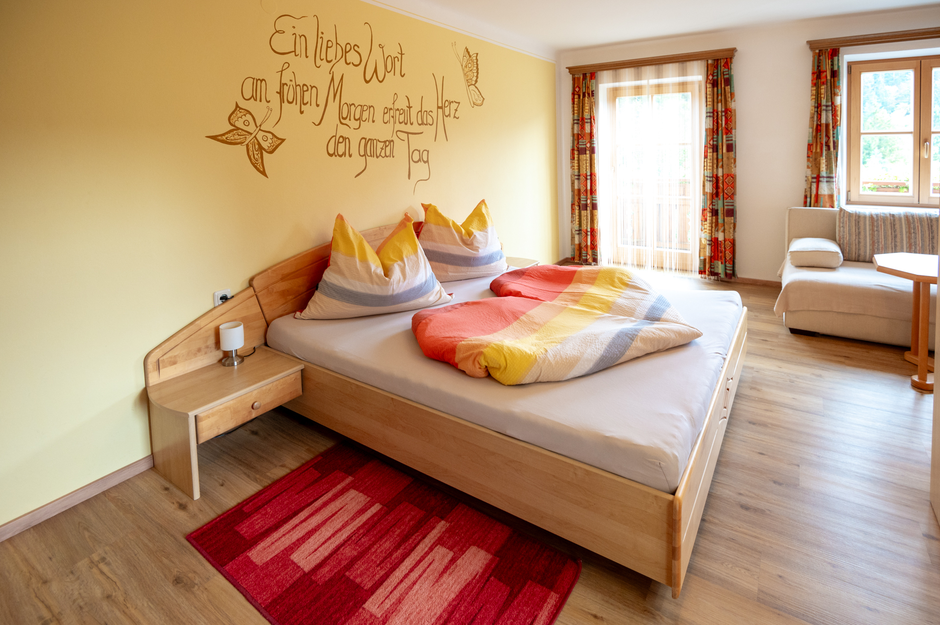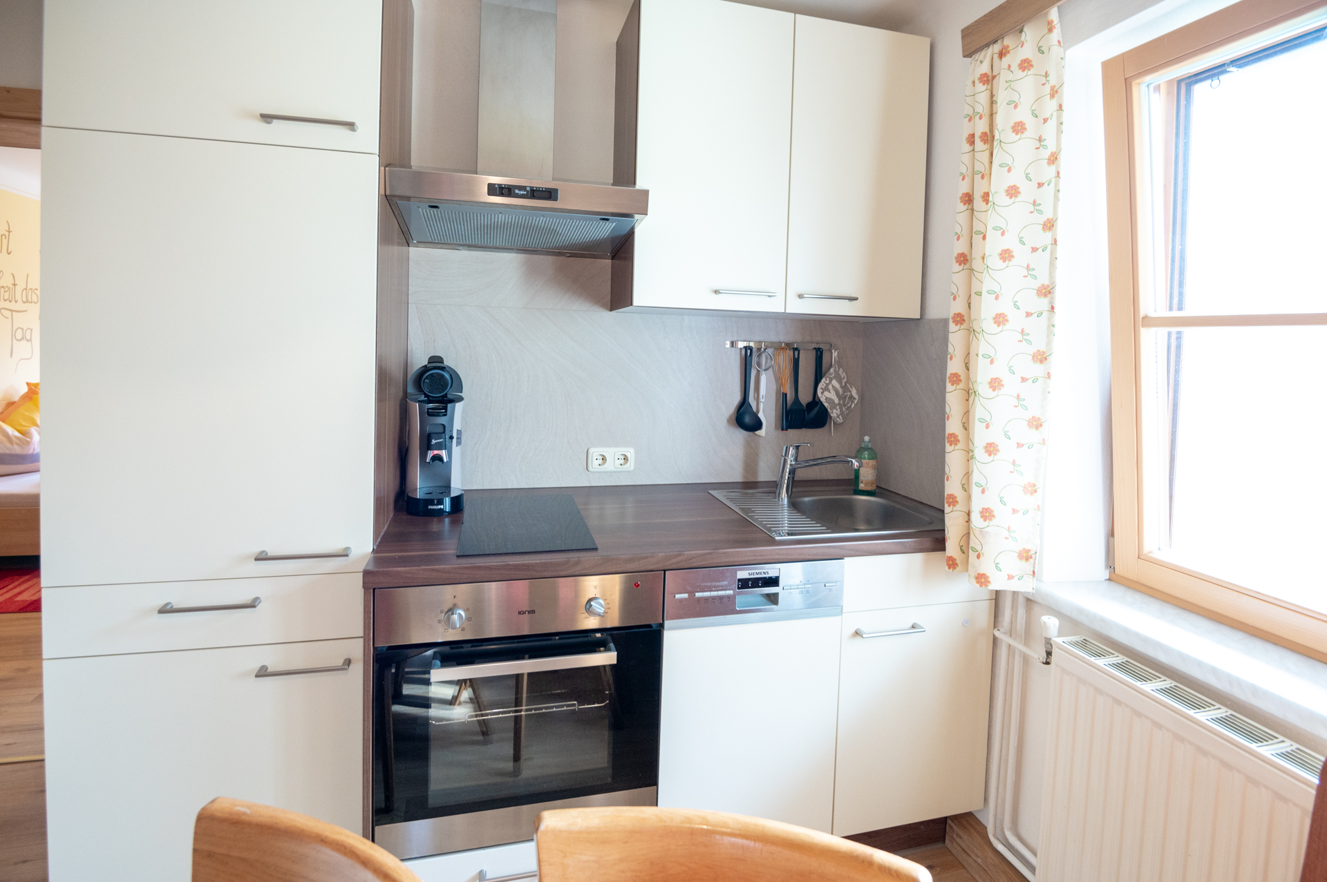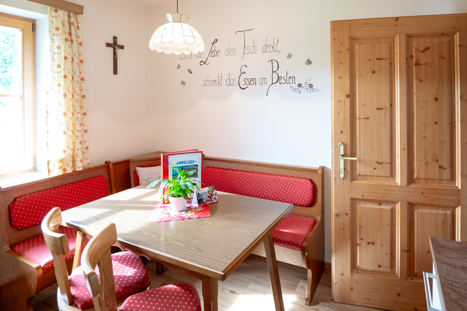 Unsere sonnige Ferienwohnung 1 liegt im 1.Stock in unserem Bauernhaus. Ein großzügiges, helles Schlaf-/Wohnzimmer mit Doppelbett und Couch (ausziehbar zu einem Doppelbett) laden zum Entspannen ein. Ein Bad mit Dusche, WC und Föhn sorgen für Komfort. SAT-TV, Wecker, eine separate Küche sowie einen Balkon finden Sie in der Ferienwohnung. Die Küche ist mit einer gemütlichen Sitzecke, Ceranfeld, Backofen, Geschirrspüler, Abwasch, Kühlschrank, Wasserkocher, Kaffeemaschine, Toaster, natürlich Geschirr, Besteck und Tischwäsche ausgestattet.