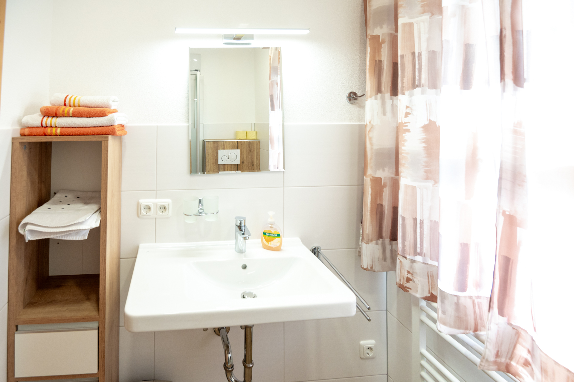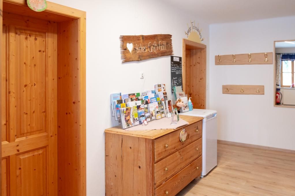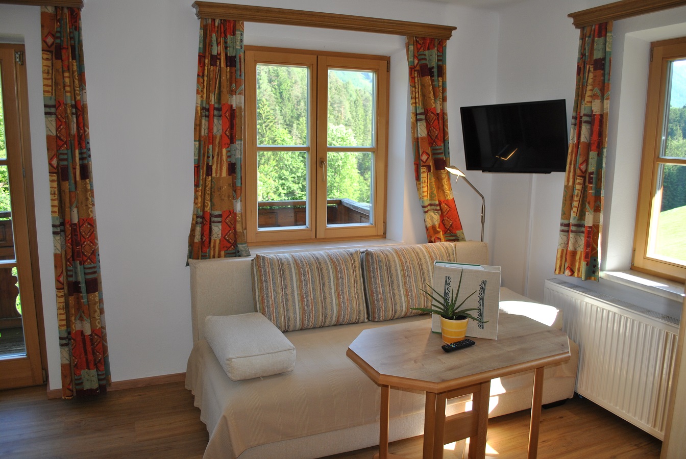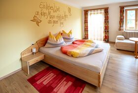Unsere sonnige Ferienwohnung 1 liegt im 1.Stock in unserem Bauernhaus. Ein großzügiges, helles Schlaf-/Wohnzimmer mit Doppelbett und Couch (ausziehbar zu einem Doppelbett) laden zum Entspannen ein. Ein Bad mit Dusche, WC und Föhn sorgen für Komfort. SAT-TV, Wecker, eine separate Küche sowie einen Balkon finden Sie in der Ferienwohnung. Die Küche ist mit einer gemütlichen Sitzecke, Ceranfeld, Backofen, Geschirrspüler, Abwasch, Kühlschrank, Wasserkocher, Kaffeemaschine, Toaster, natürlich Geschirr, Besteck und Tischwäsche ausgestattet.