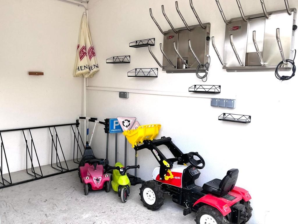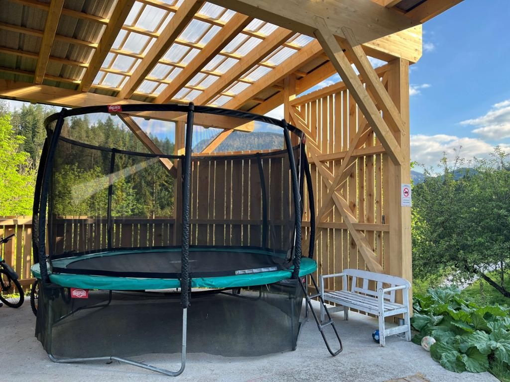 Spielplatz im Freien mit Schaukeln, großes Trampolin, Kinderfahrzeuge, Sandkiste,….