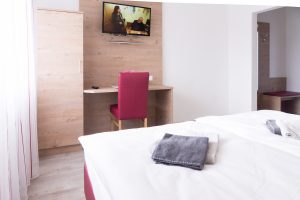 Zimmerausstattung: Dusche, WC, Fön, Gäste-WLAN, Flat Screen TV mit Sat.