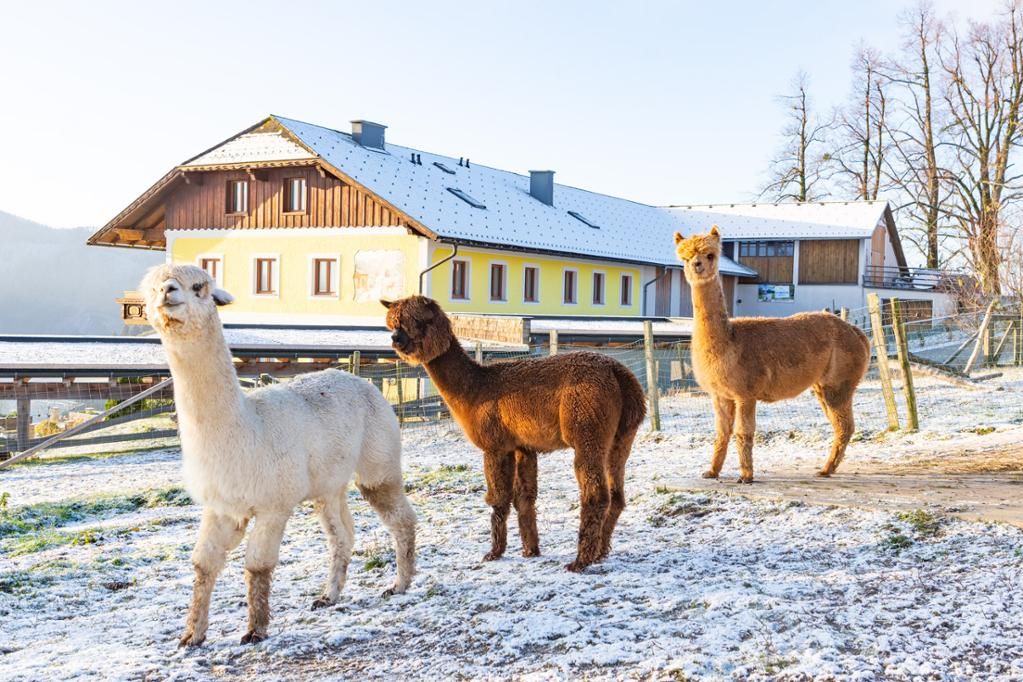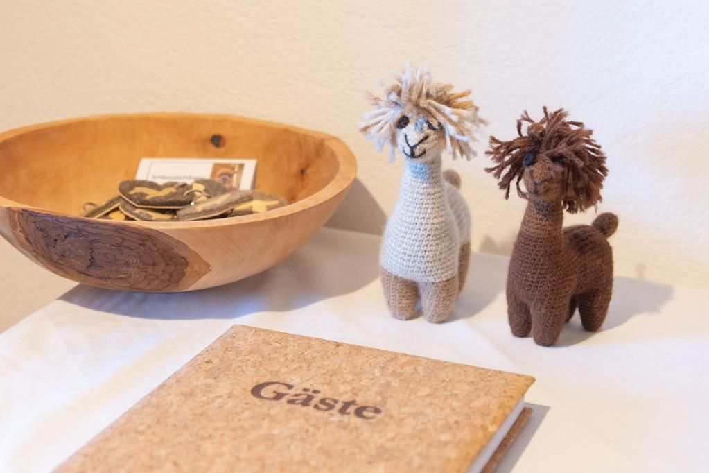 Sanftmütige Alpakas leben auf dem Hof und können bei geführten Wanderungen begleitet werden. Zudem sind hochwertige Alpakaprodukte wie Decken, Schuheinlagen und Wolle erhältlich.