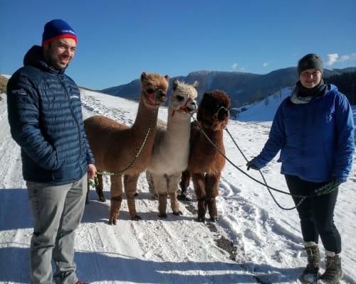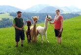 Sanftmütige Alpakas leben auf dem Hof und können bei geführten Wanderungen begleitet werden. Zudem sind hochwertige Alpakaprodukte wie Decken, Schuheinlagen und Wolle erhältlich.