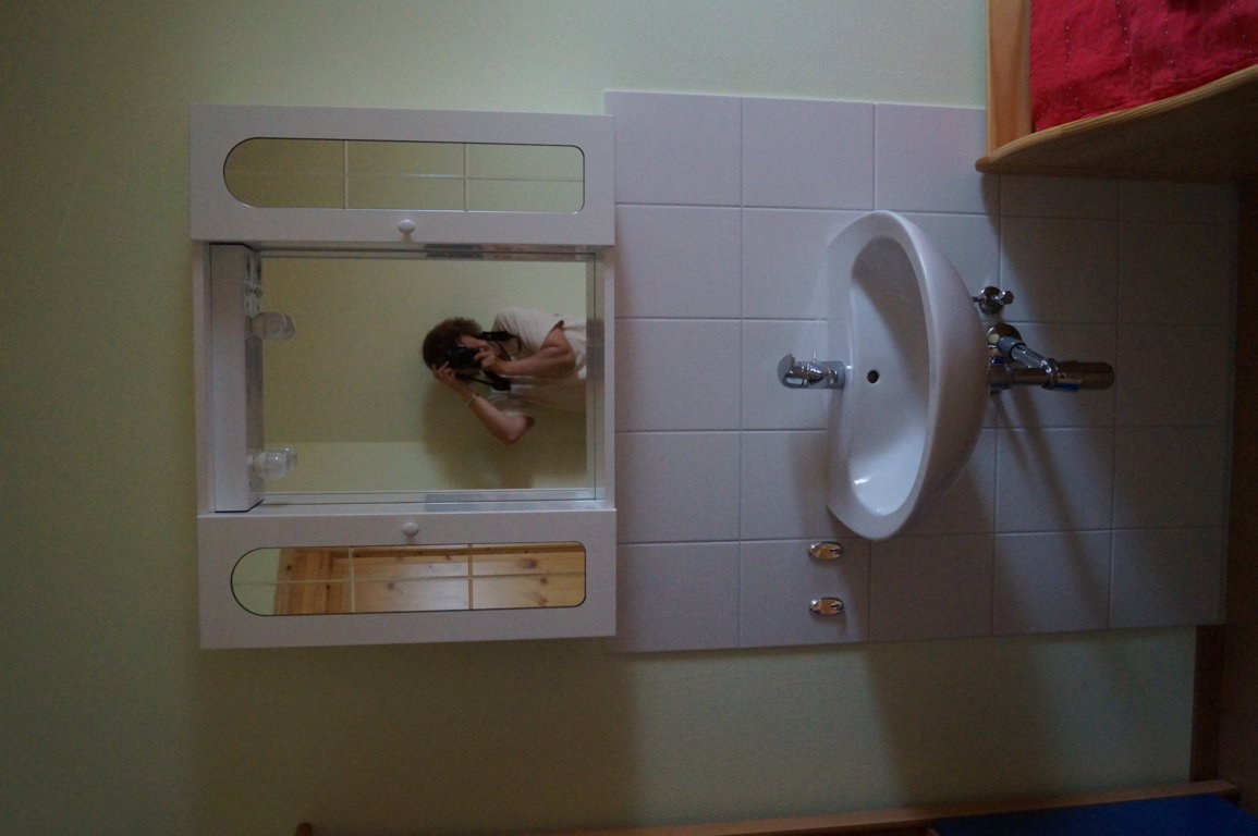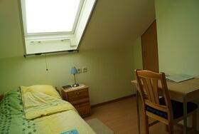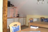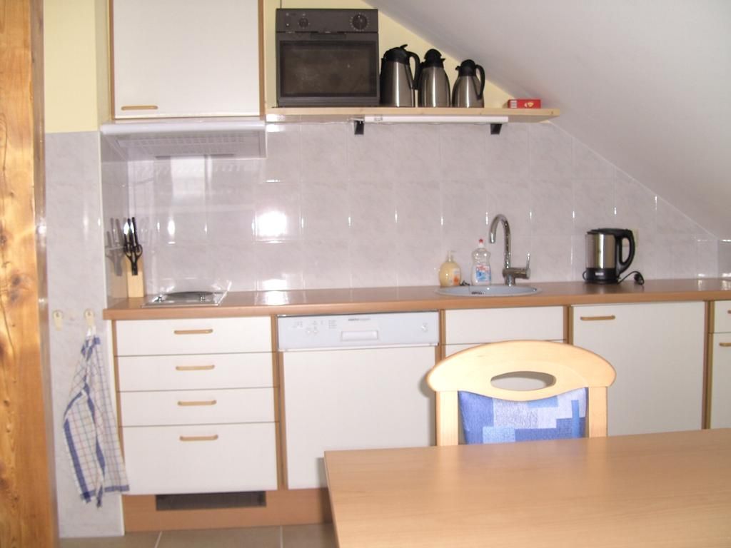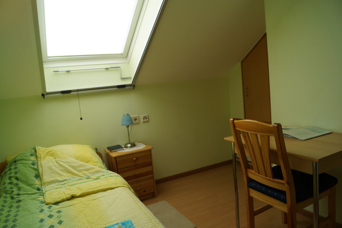 Für alle 4 Zimmer der Gästeetage gibt es einen gemeinsamen Frühstücks- oder Aufenthaltsraum mit eingerichteter Küchenzeile. Sie haben dort einen Kühlschrank mit Gefrierfach zur Verfügung und zwei Herdplatten, eine Mikrowelle, Wasserkocher, Kaffeemaschine und einen kleinen Backofen. Er ist - ausser bei bestelltem Frühstück zwischen 7 und 9 h - frei zu benutzen und muss für alle anderen einfach in Ordnung hinterlassen werden. Übrigens Beschädigungen sind nicht im Preis inkludiert.