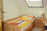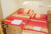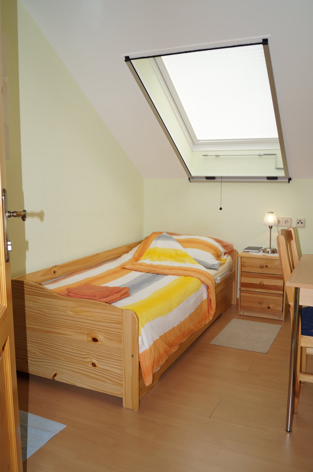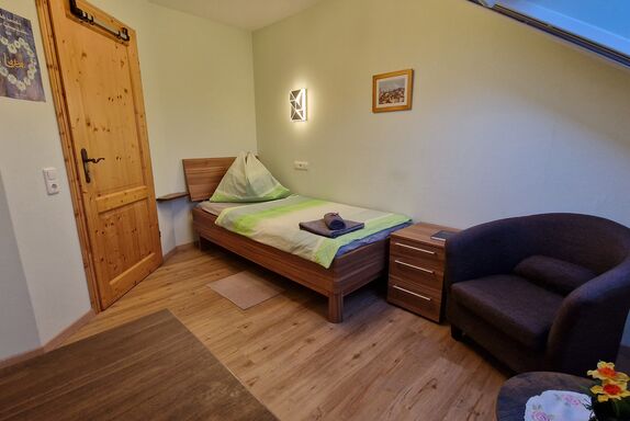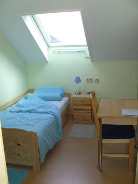 Kleines Einzelzimmer für „Anspruchslose“ mit bequemem Bett und Ausziehteil für eine zweite Person auf Anfrage, Nachtkästchen, Waschgelegenheit, Allibert, Kasten, Einbauschrank, Tisch und Sessel. Einfach und behaglich. Wer ein Zimmer nur zum Schlafen braucht und viel unterwegs ist.