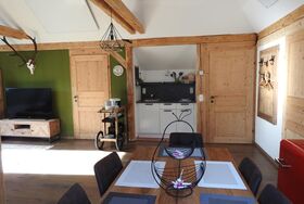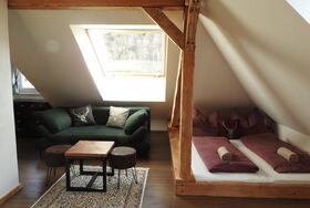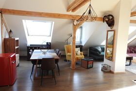 Das Dachgeschoß ist zu einem 70m² offenen Loft ausgebaut und bietet Platz für bis zu 4 Personen. In dem Apartment befindet sich eine kleine Einbauküche, ein Esstisch, eine Couch, ein Lesesessel und zwei in Dachnischen eingebaute Doppelbetten. Ein kleiner Sanitärbereich mit Dusche und WC ist separat in einer Dachschräge verbaut. WLAN steht Ihnen kostenfrei zur Verfügung.