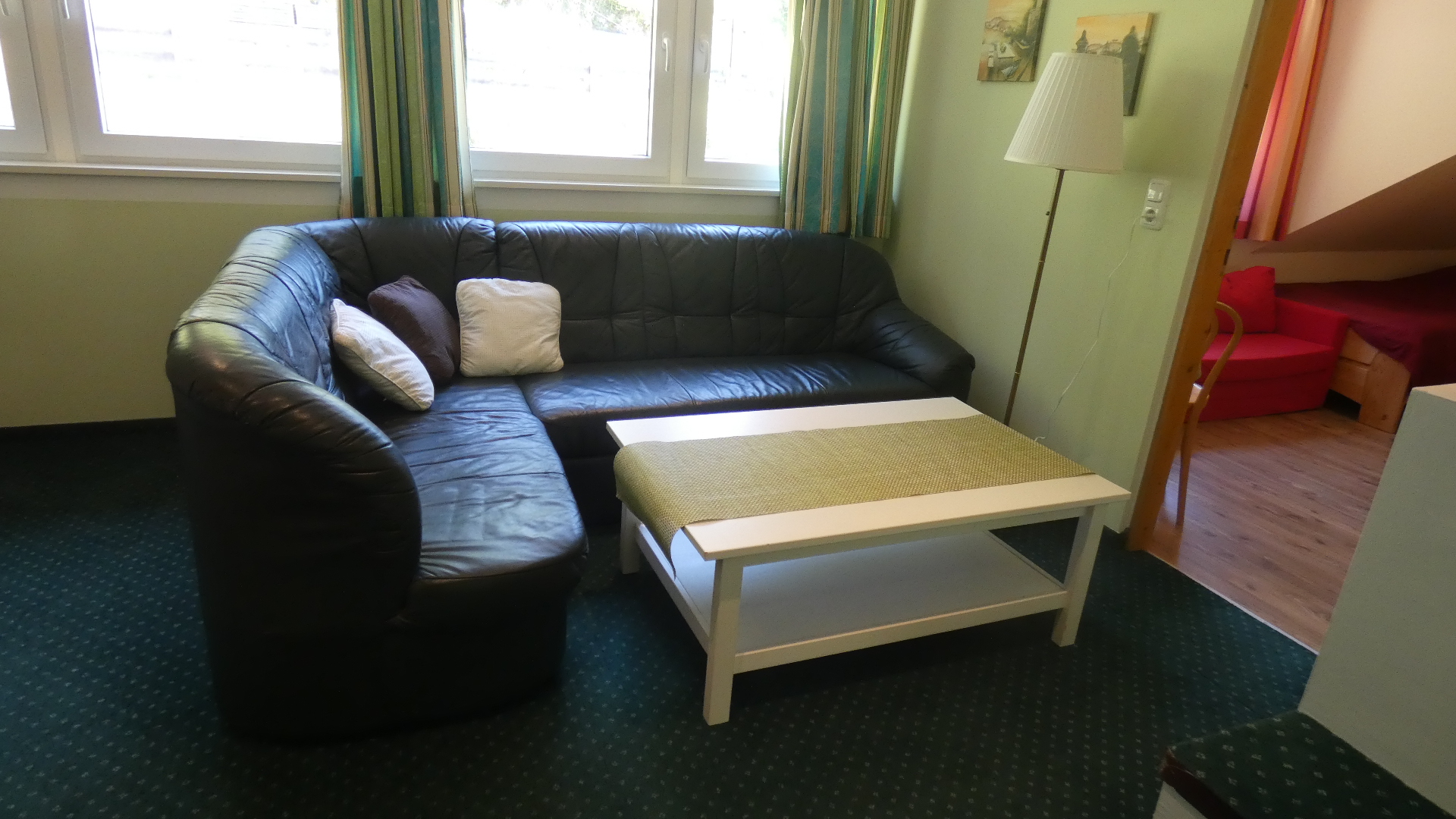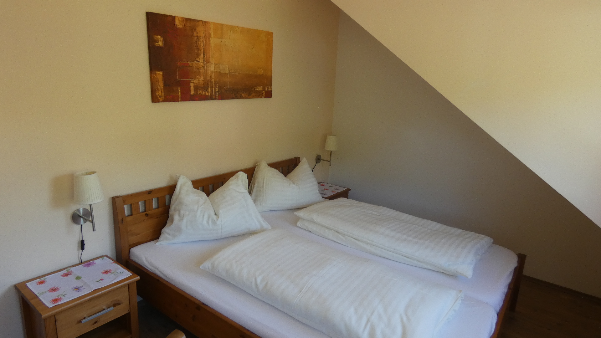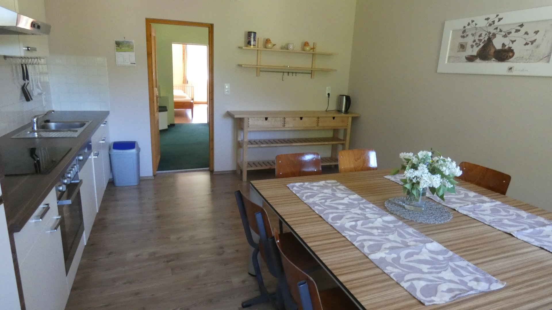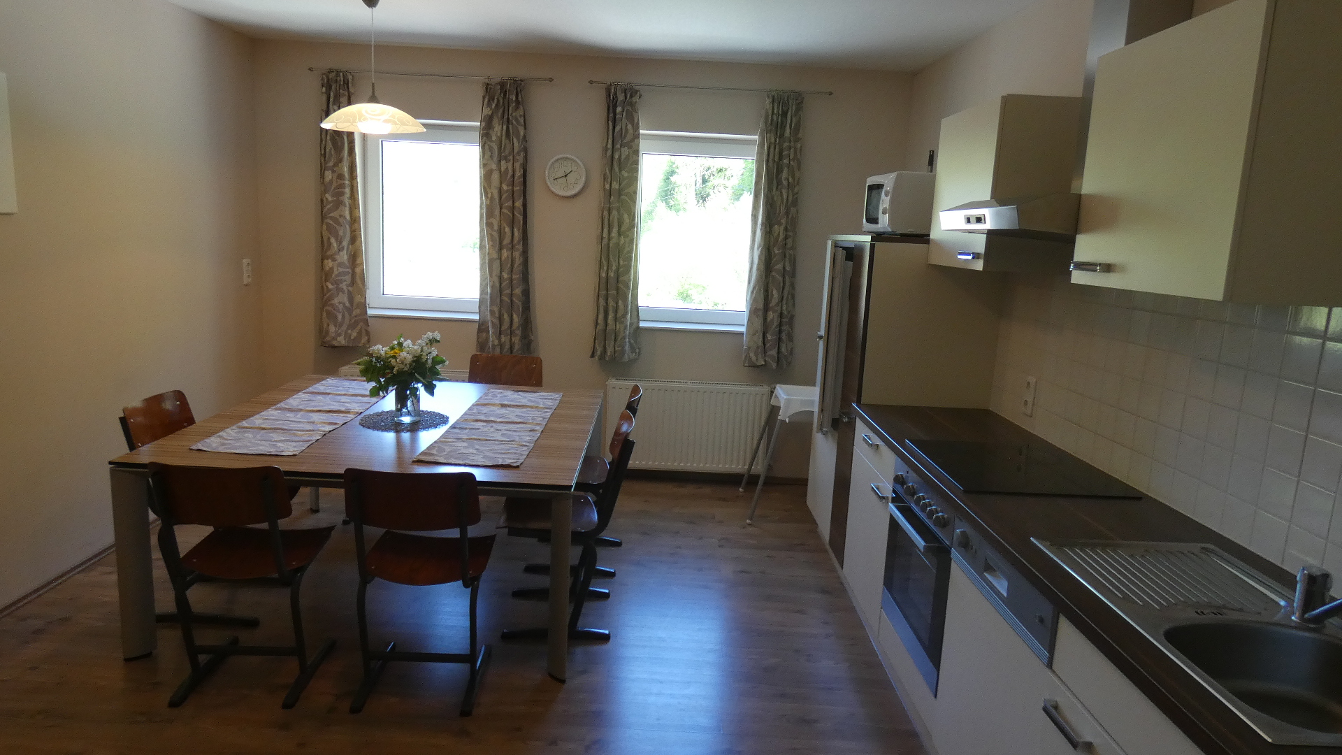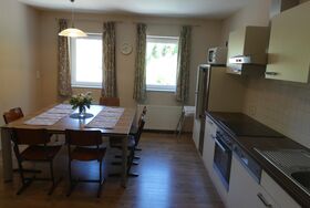 Das Appartement Nr. 5 ist das Luxusappartemet im Haus und befindet sich im zweiten Stock. Es verfügt auf einer Größe von etwa 125 qm über 4 gemütliche Schlafzimmer. Drei der Schlafzimmer sind mit jeweils einem Doppelbett ausgestattet, das vierte Schlafzimmer mit 2 getrennt stehenden Betten. Die separate Wohnküche verfügt über Kühlschrank, Backofen, Kochfeld sowie eine Mikrowelle. Am großen komfortablen Esstisch können Sie entspannt zu Abend essen und den Tag bei einem Glas Wein ausklingen lassen. Das Badezimmer mit Tageslicht hält Dusche, WC sowie einen Haartrockner bereit. Kostenfreies WLAN rundet das Gesamtpaket ab.