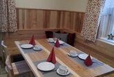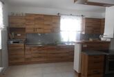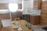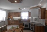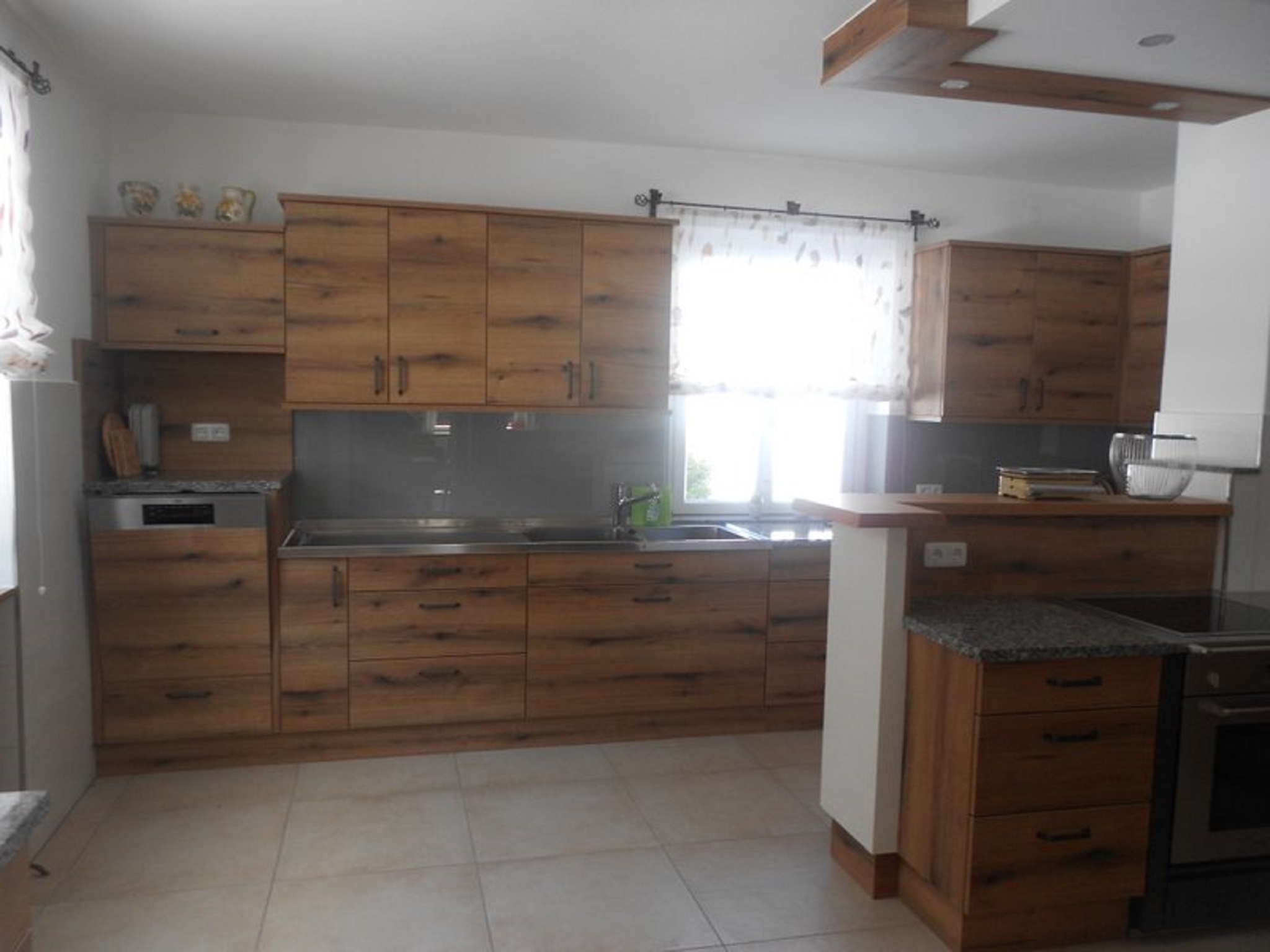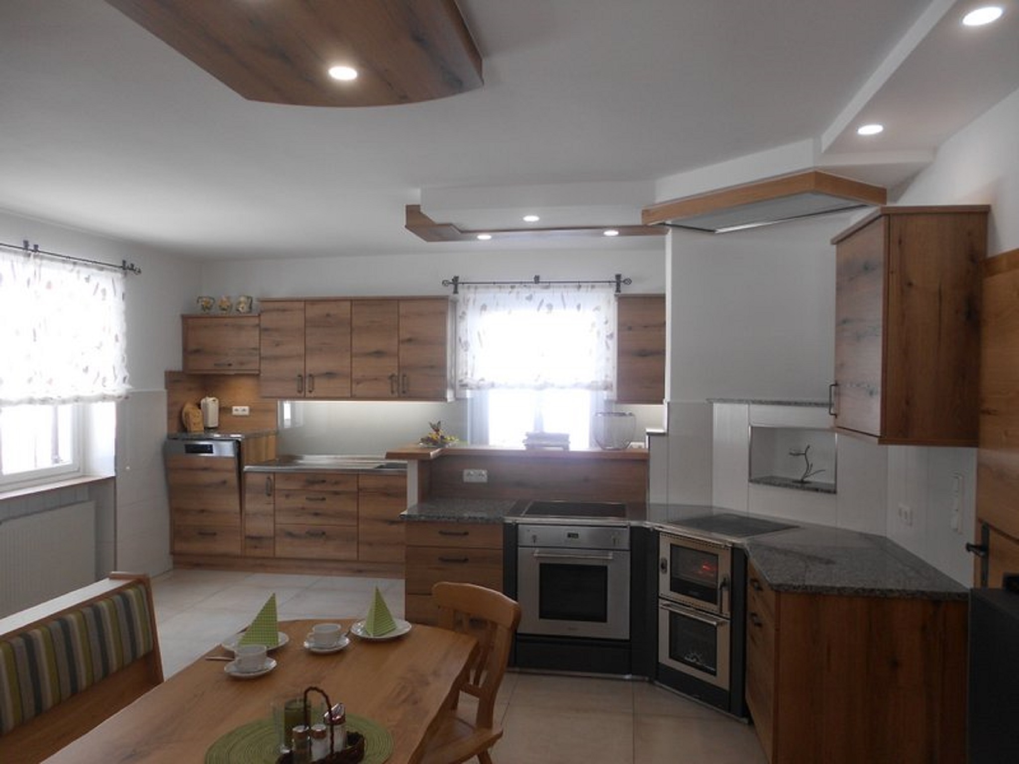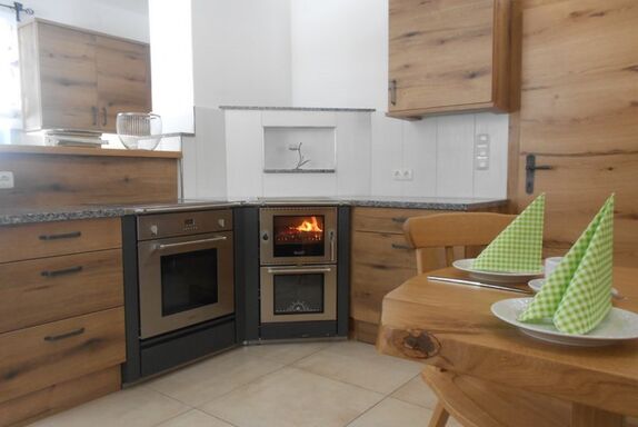 Die große Küche ist mit einem Elektro- & Holzherd, Mikrowelle, Geschirrspüler, Kühlschrank, Wasserkocher, Kaffeemaschine und ausreichend Koch- und Essgeschirr eingerichtet.