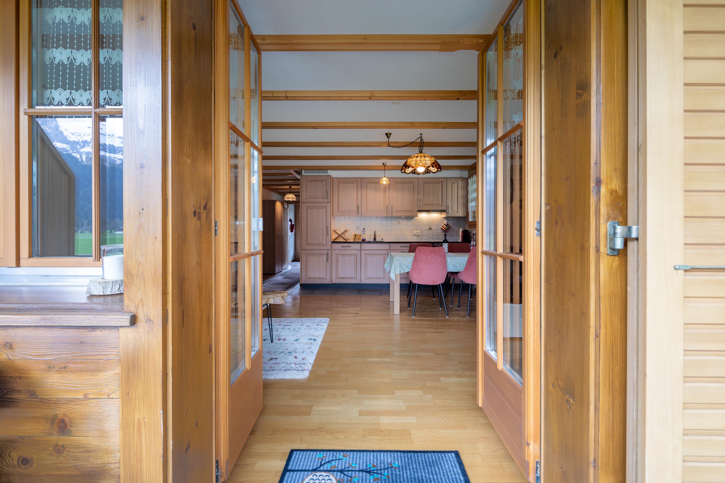 Schöne 3.5 Zimmer-Ferienwohnung in einem Mehrfamilienhaus im 1. Stock links. Die Wohnung eignet sich für 4 Personen und ist ausgestattet mit Wohn-/Esszimmer, Schwedenofen, Sofa, Swisscom TV, DVD Player und Radio. Küche mit Geschirrspüler, Filter-Kaffeemaschine und Nespresso Kaffeeemaschine. Elternschlafzimmer mit einem Doppelbett (160x200 cm). Zweites Schlafzimmer mit zwei Einzelbetten (90x200 cm). Badezimmer mit Sprudelwanne/Dusche. Separates WC (Trennwand zum Badezimmer). Die Wohnung verfügt über einen Balkon mit einem Tisch und vier Stühlen. Das Rauchen auf dem Balkon ist erlaubt. Im Winter stehen zwei Kinderschlitten zur Verfügung.