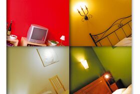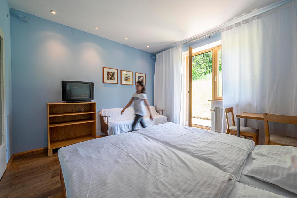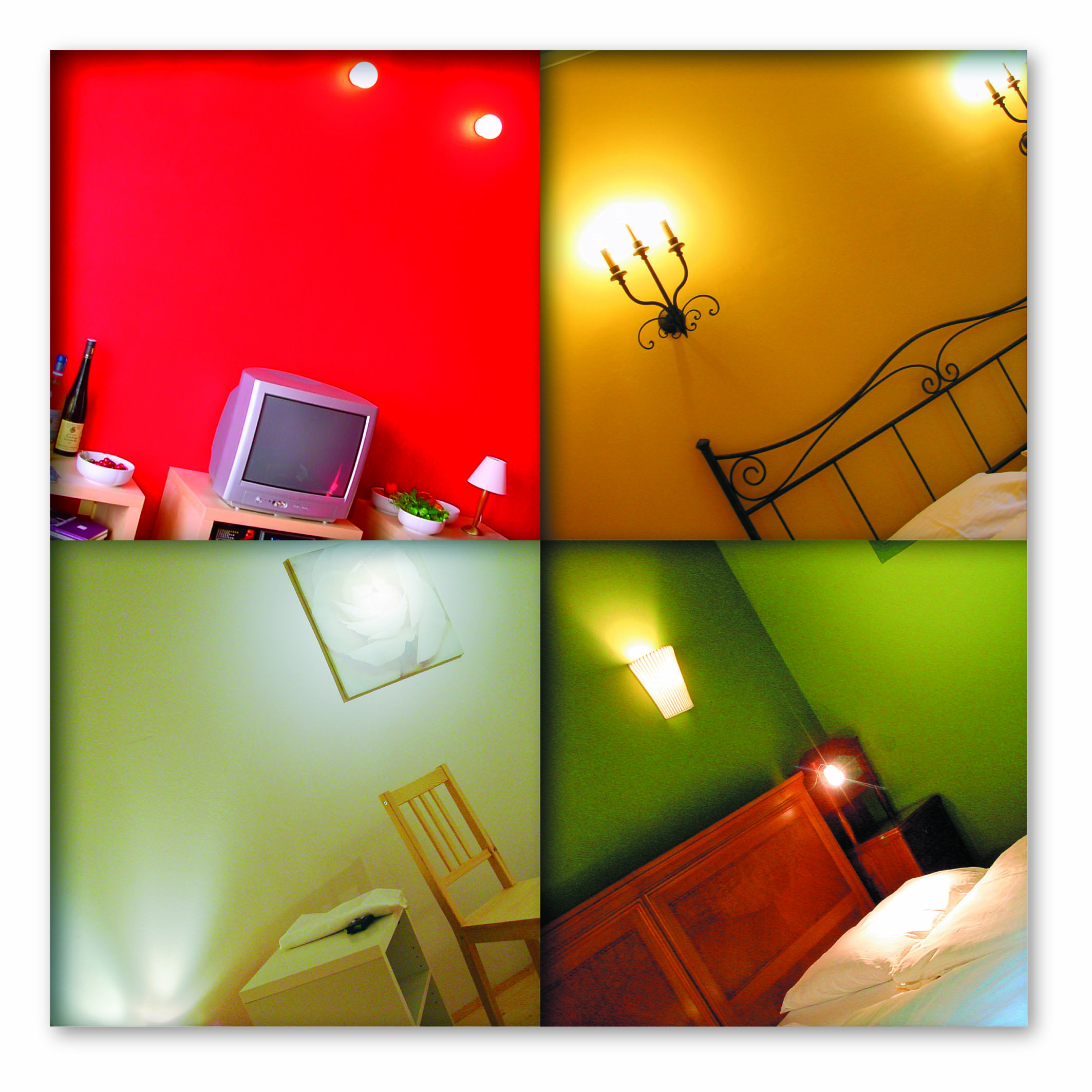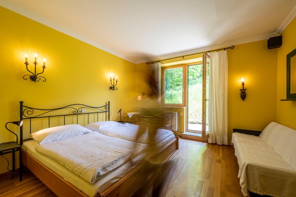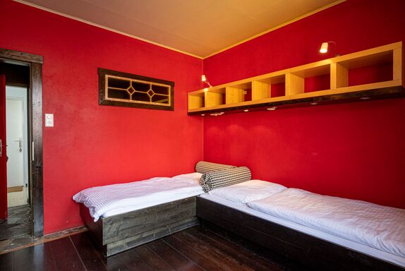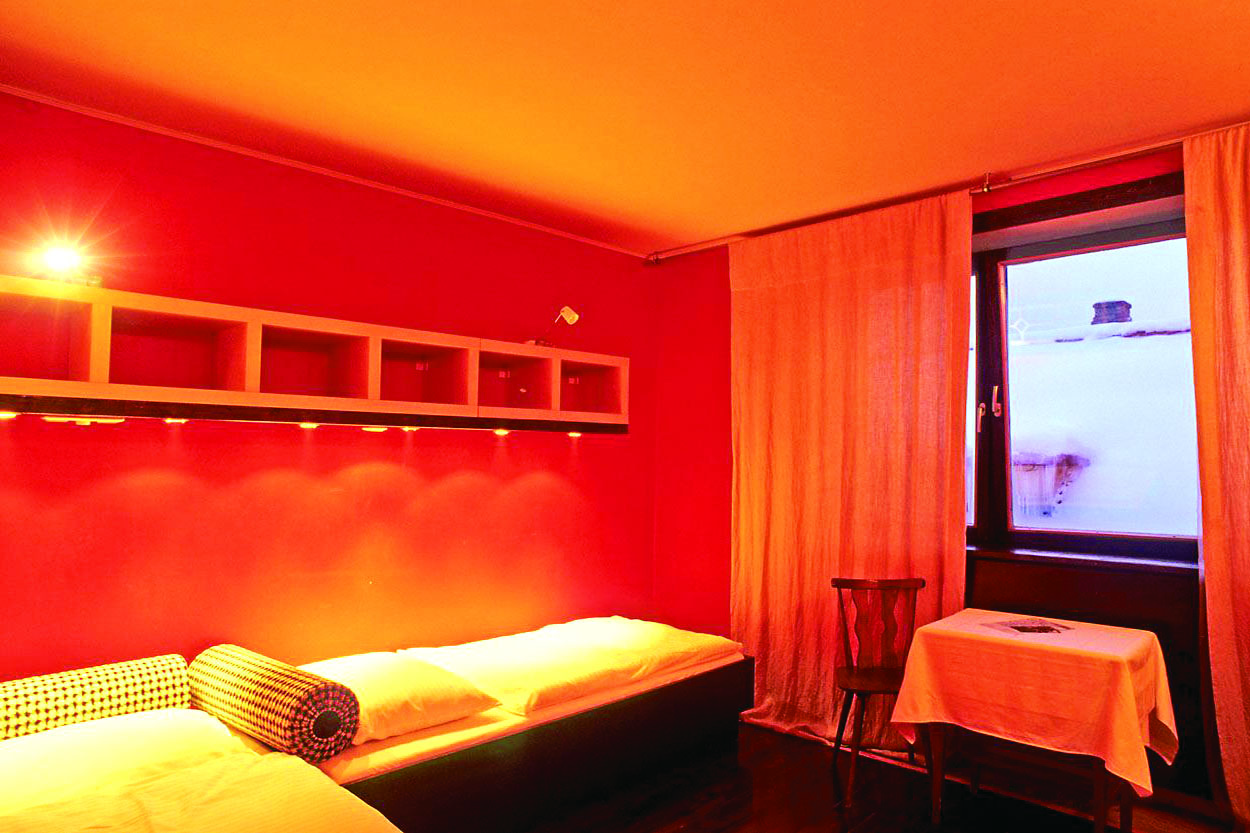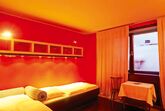 ca. 20 m² - Geräumiges Zimmer mit tollen Lichteffekten. Das Bad ist mit speziellen Steinen verfliest, Dusche/WC, hofseitig. Das Rote Zimmer ist mit zwei Einzelbetten ausgestattet.
