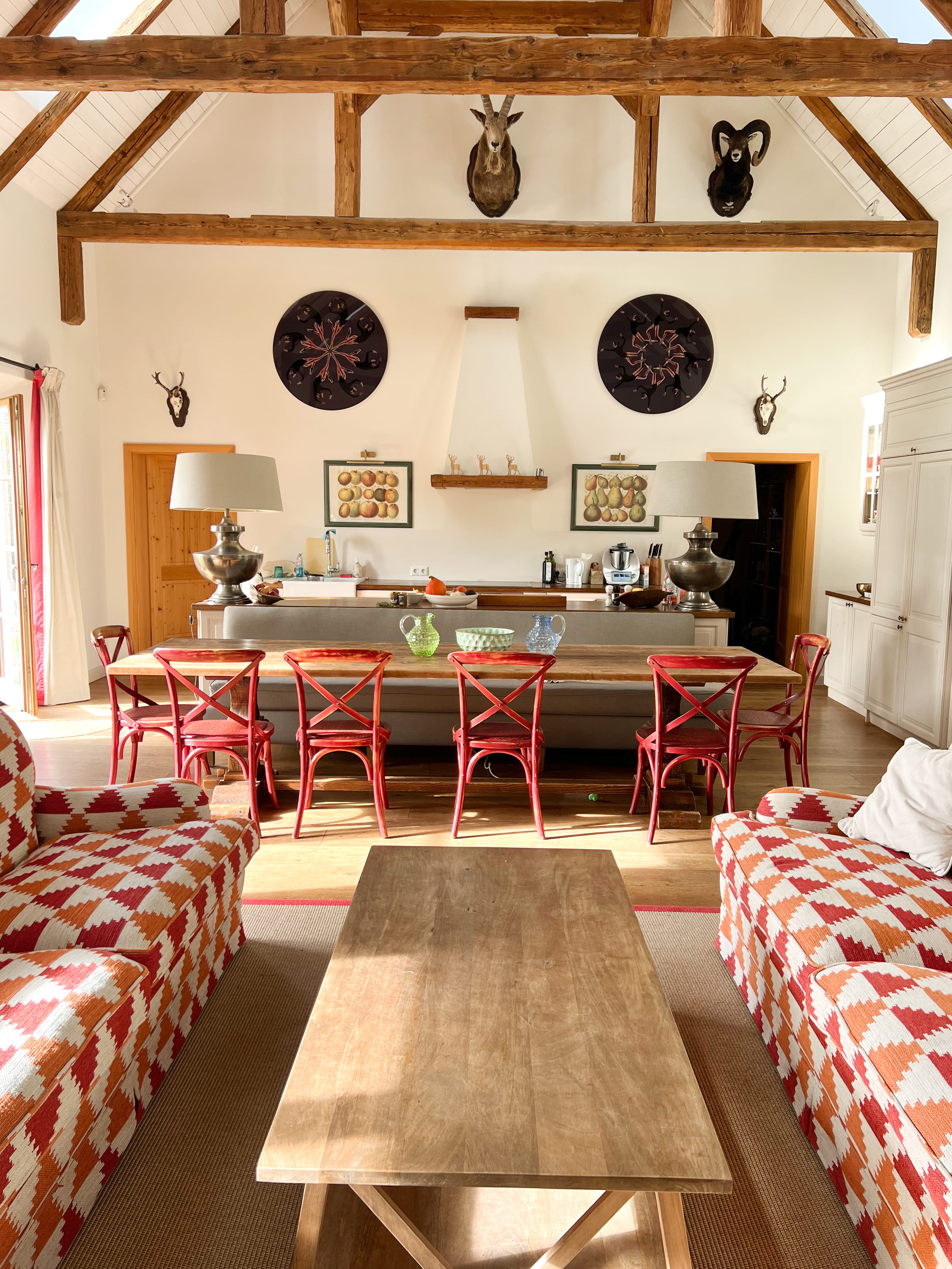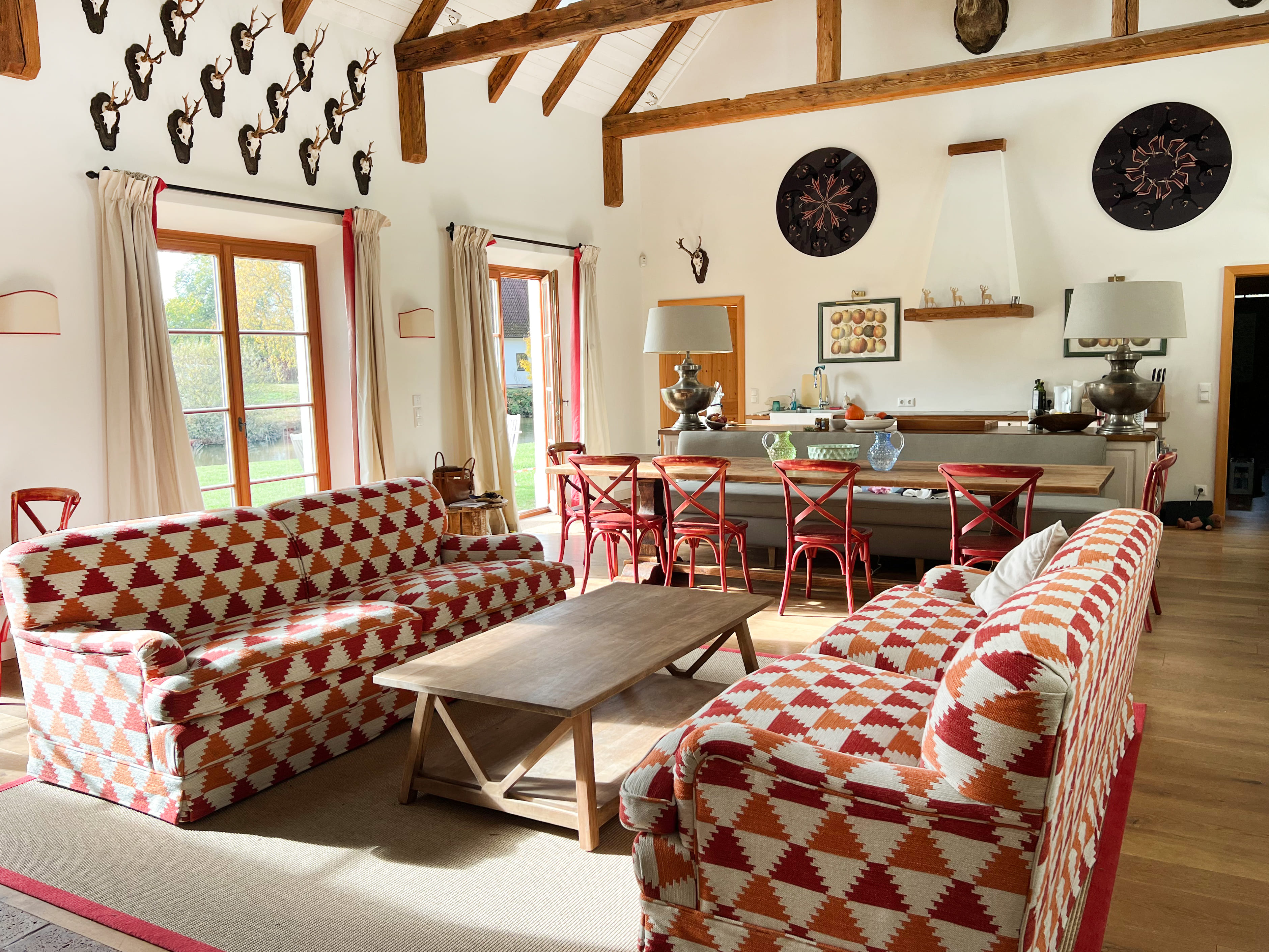 Durch das Wohnzimmer gelangen Sie direkt in den Garten mit großer Terrasse mit 2 Esstischen, Stühlen, Markise und Holzkohle-Griller. Der 3.000 m² große und private Schwimmteich mit Badesteg steht Ihnen zur Nutzung zur Verfügung.