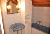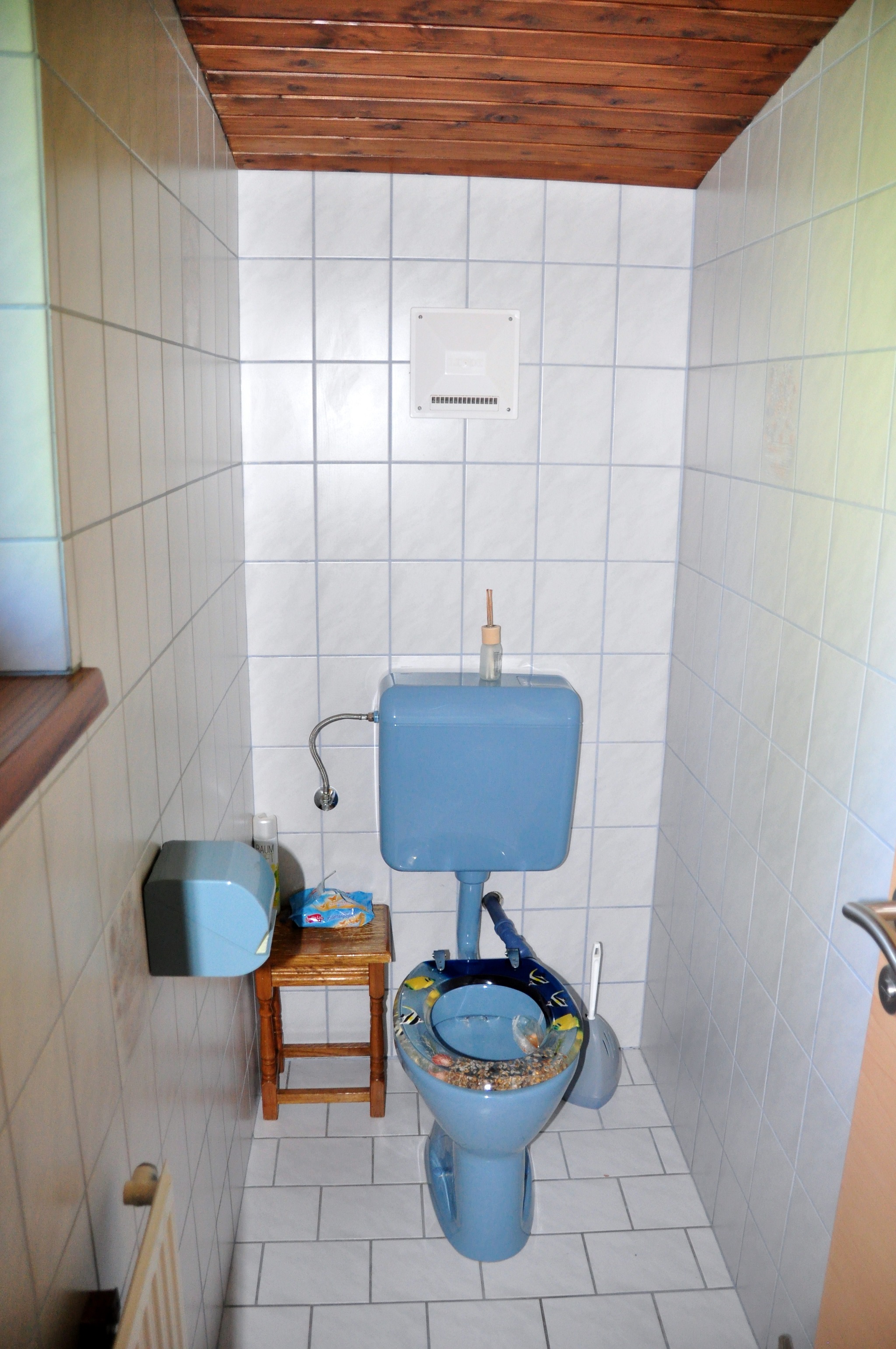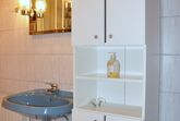 Das Badezimmer ist mit einer Dusche, Badewanne, Waschtisch, Spiegelschrank, Badschrank, Duschgel und Föhn eingerichtet. Die Toilette ist getrennt vom Badezimmer und verfügt über ein Fenster.
