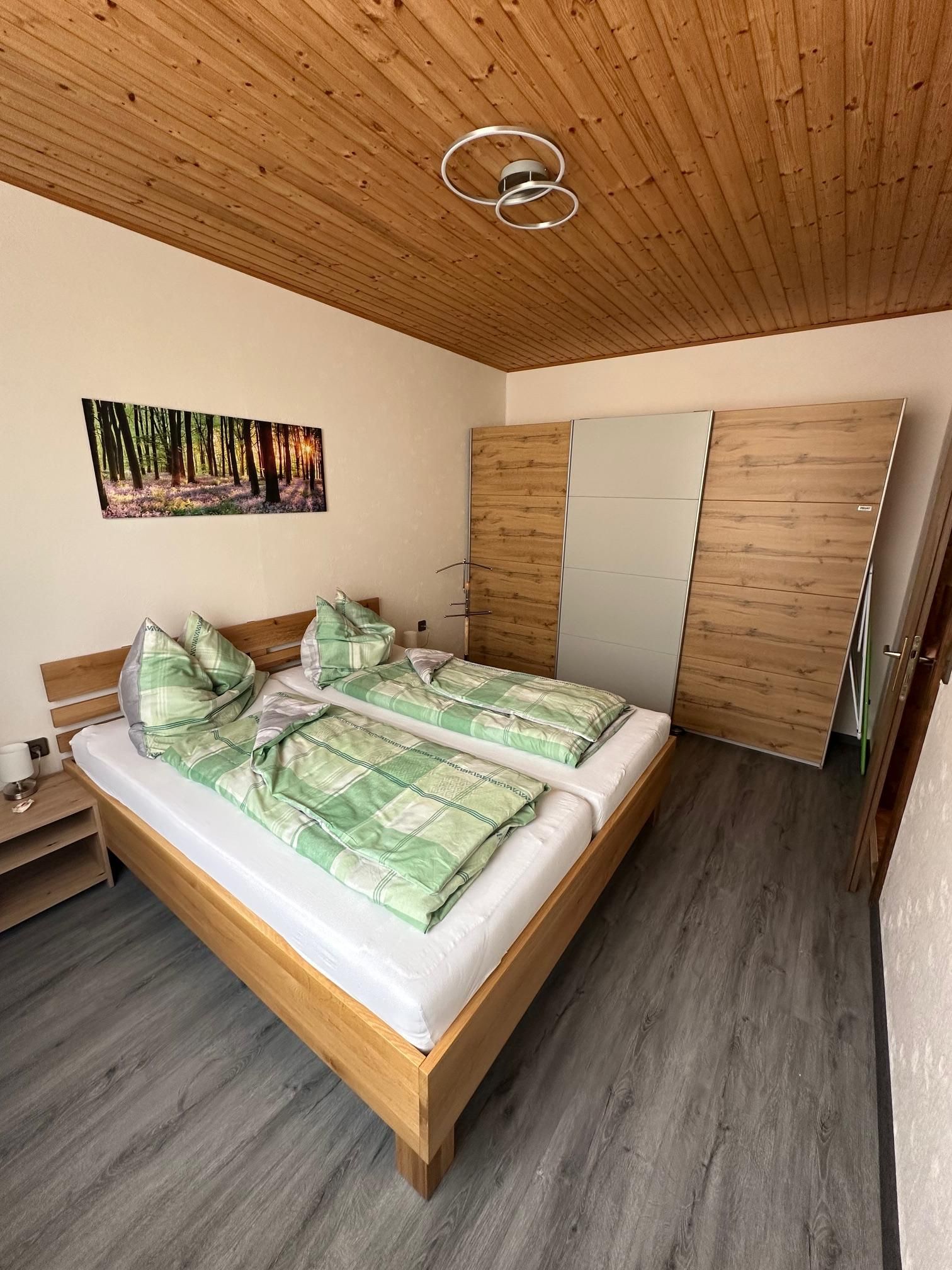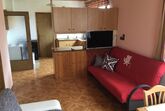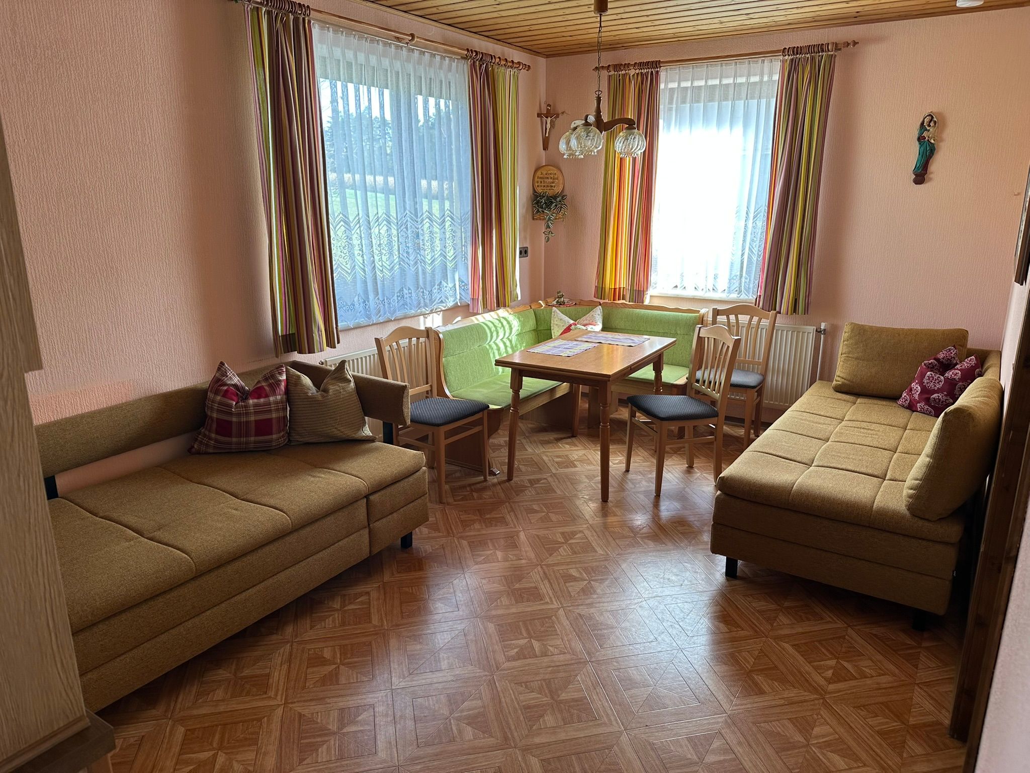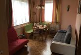 Unsere Ferienwohnung besteht aus einem Vorraum, Bad mit WC, einer Wohnküche mit 2 Sofas und einem Schlafzimmer mit Doppelbett, und einem Abstellraum - bei uns heisst es: die Speis'. Dort befindet sich auch der Kühlschrank und die Gefriertruhe mit dem Frühstücksgebäck. Die Küche ist mit einem Elektroherd mit Backrohr ausgestattet, es gibt auch einen Minibackofen, Mikrowelle, Wasserkocher und eine Kaffeemaschine. Ess- und Kochgeschirr ist vorhanden und ein TV-Gerät ist im Wohnbereich angebracht. Die Essgruppe bietet genug Platz für vier Personen. Die beiden Sofas können in Betten umgewandelt werden. Im Schlafzimmer befindet sich ein Doppelbett und ein Kleiderschrank. Das Badezimmer ist mit Dusche ausgestattet, das WC kann mit einer Falttüre abgetrennt werden.