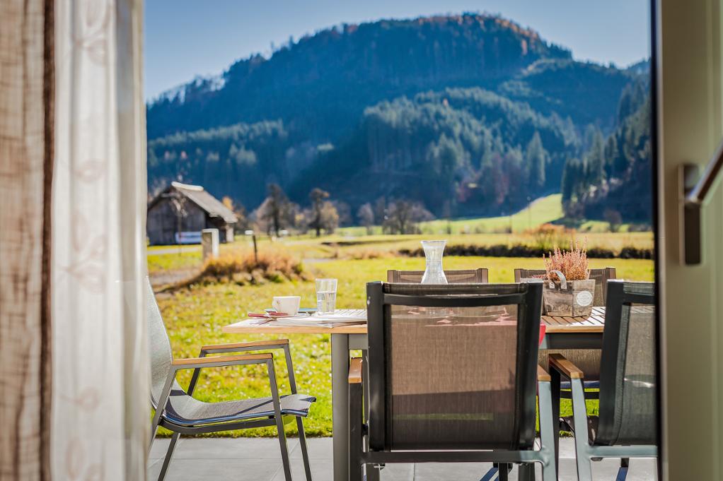 Durch eine große Schiebetür gelangen sie auf die sonnige Terrasse.